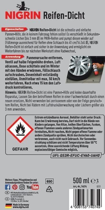 Nigrin NIGRIN Reifendicht Sofortige Pannenhilfe Reifendichtmittel Löcher Reifen 500 ml