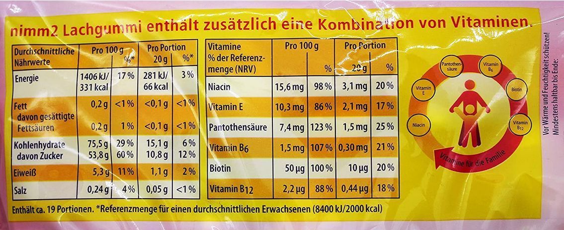 nimm2 Lachgummi Joghurt Euro 225g Euro Fruchtgummi mit Vitaminen 3 Varianten - je 225g - Varianten von 1 bis 9 Packungen Produktbeschreibung Fruchtgummi mit Vitaminen und Magermilchjoghurt In 6 leckeren Geschmacksrichtungen: Bannane, Himbeere, Blutorange, Orange, Zitrone und Apfel-Birne Mit Fruchtsa