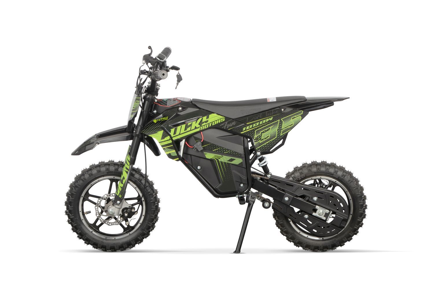 Art.-Nr.: 1173088 NITRO MOTORS 1000W Eco mini Kinder Dirtbike Lucky Fun 10 3 Stufen Drossel Power Anzeige Zündschloss Besonderheiten: 1000W Elektro Motor 36V 12Ah Blei Gel Akku Zündschloss mit 2 Schlüsseln Up side down Alu Stoßdämpfer 3-Stufen Drossel mit Schlüssel zum Absperren Max Geschwindigkeit