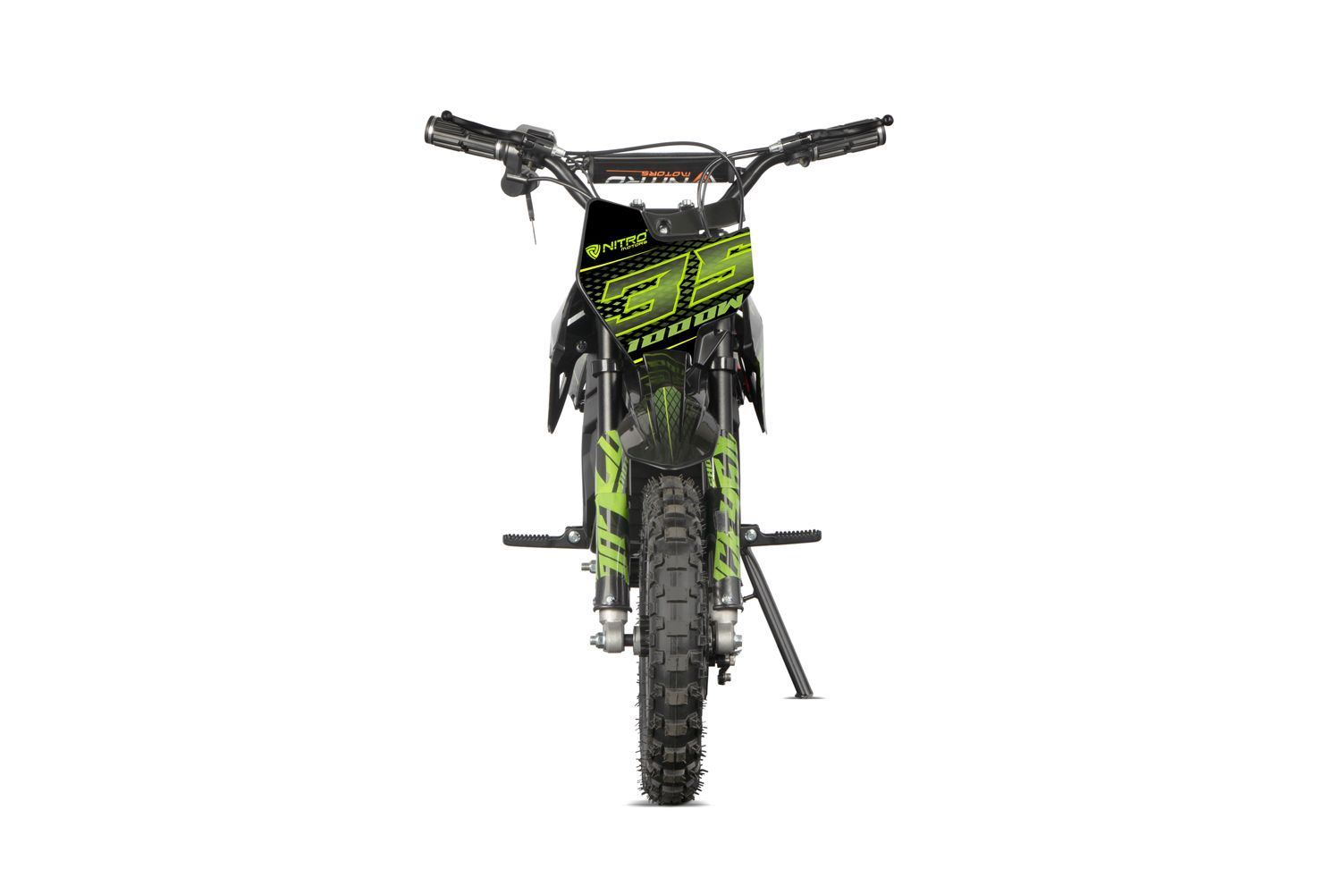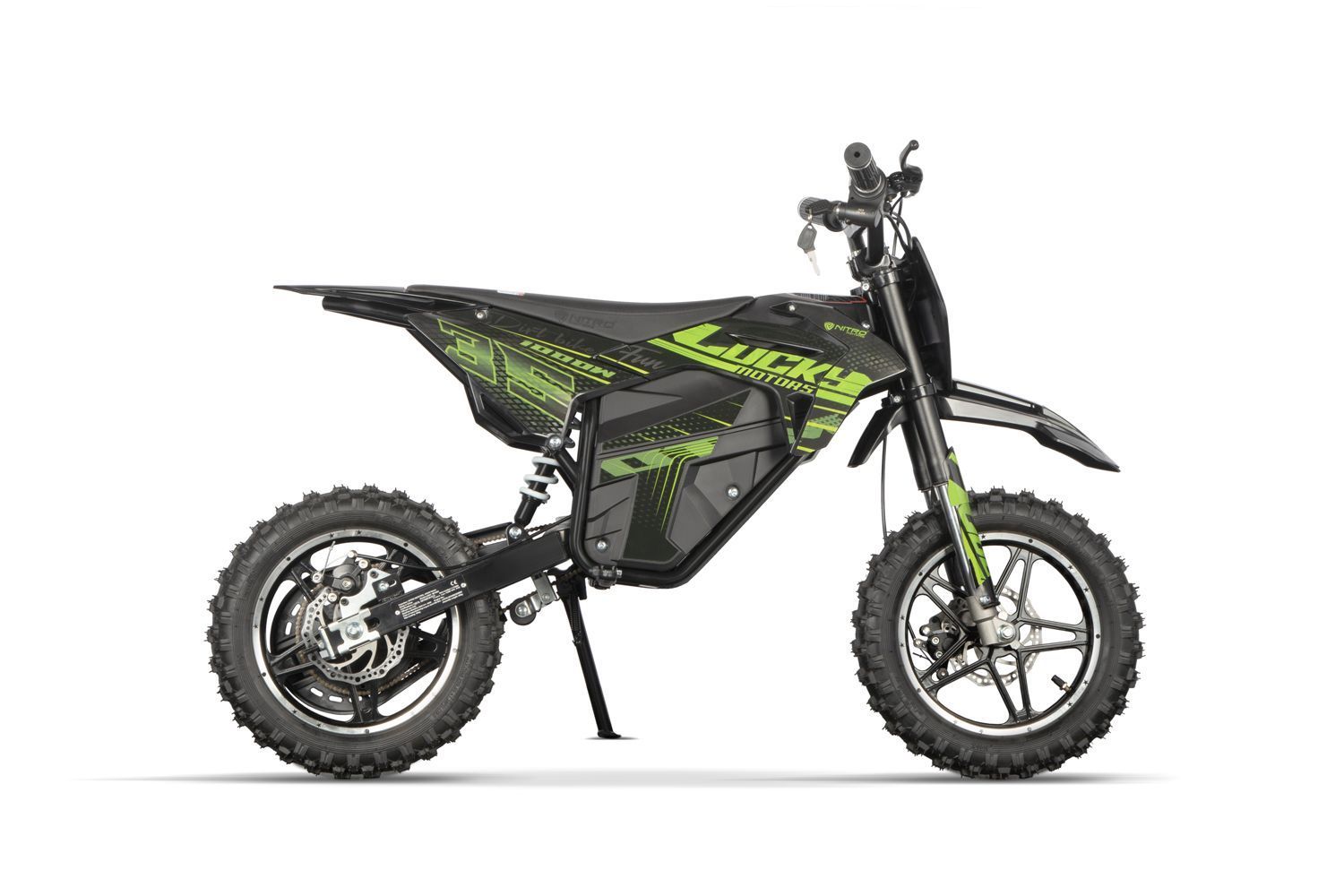 Nitro Motors 1000W Eco-Dirtbike Lucky Serie Fun E-Start 3 Geschwindigkeitsstufen Besonderheiten: - 1000W 12Ah Motor - E-Start - 3 Geschwindigkeitsstufen - Scheibenbremsen vorne und hinten - Kettenantrieb - Max Geschwindigkeit 28km h - Nettogewicht 38kg - Bruttogewicht 41kg - Reifen vorne und hinten