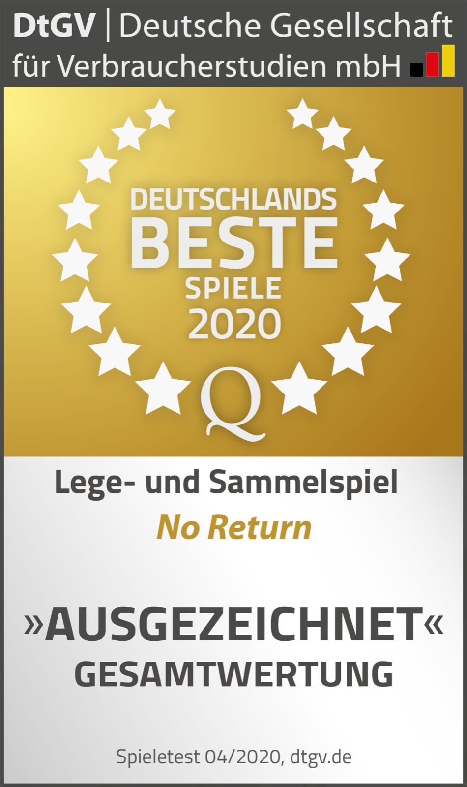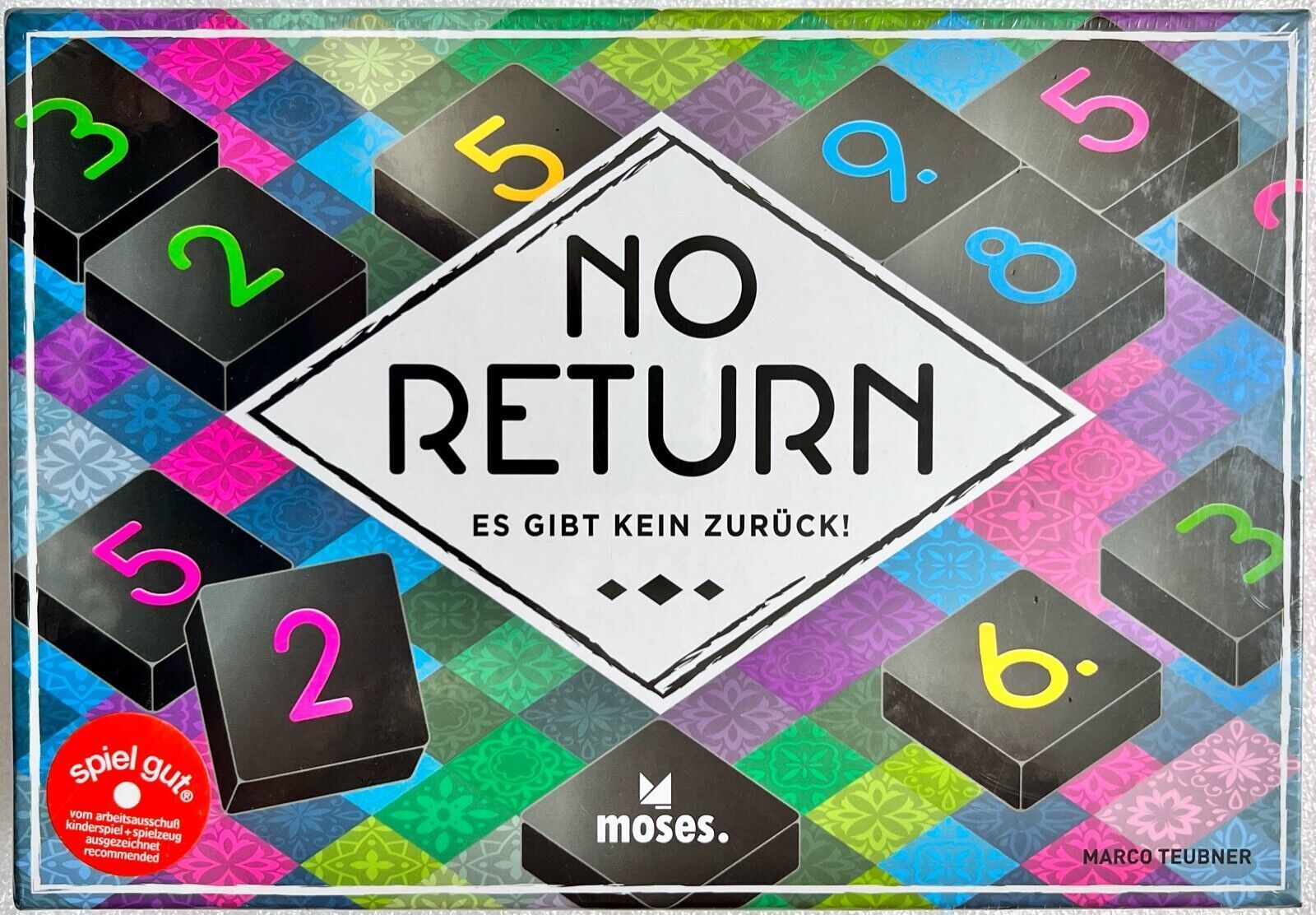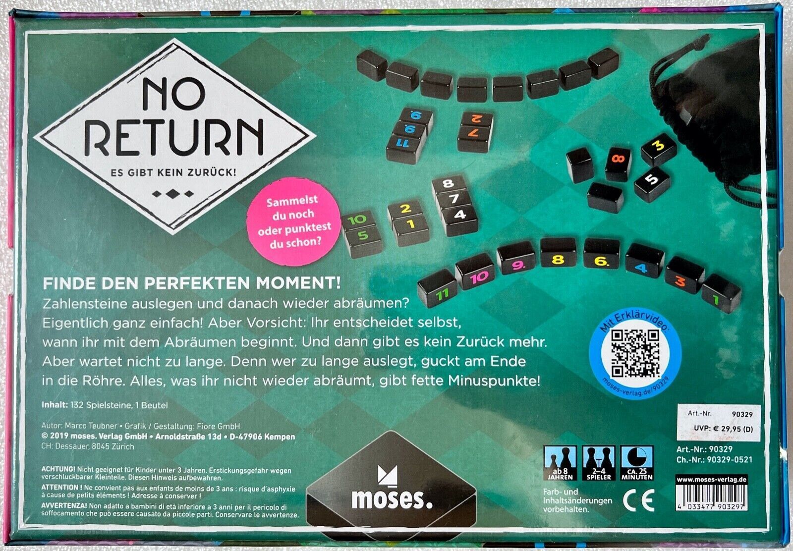 Spieleranzahl: 2 bis 4 Spieler Spieldauer: 25 Minuten Altersempfehlung: 8 + No Return - Lege- und Sammelspiel Wann ist der Point of No ReturnEuro Nur wer den perfekten Moment findet, hat die Chance auf einen glorreichen Sieg. Zahlensteine auslegen und danach wieder abräumenEuro Das Prinzip dieses sp