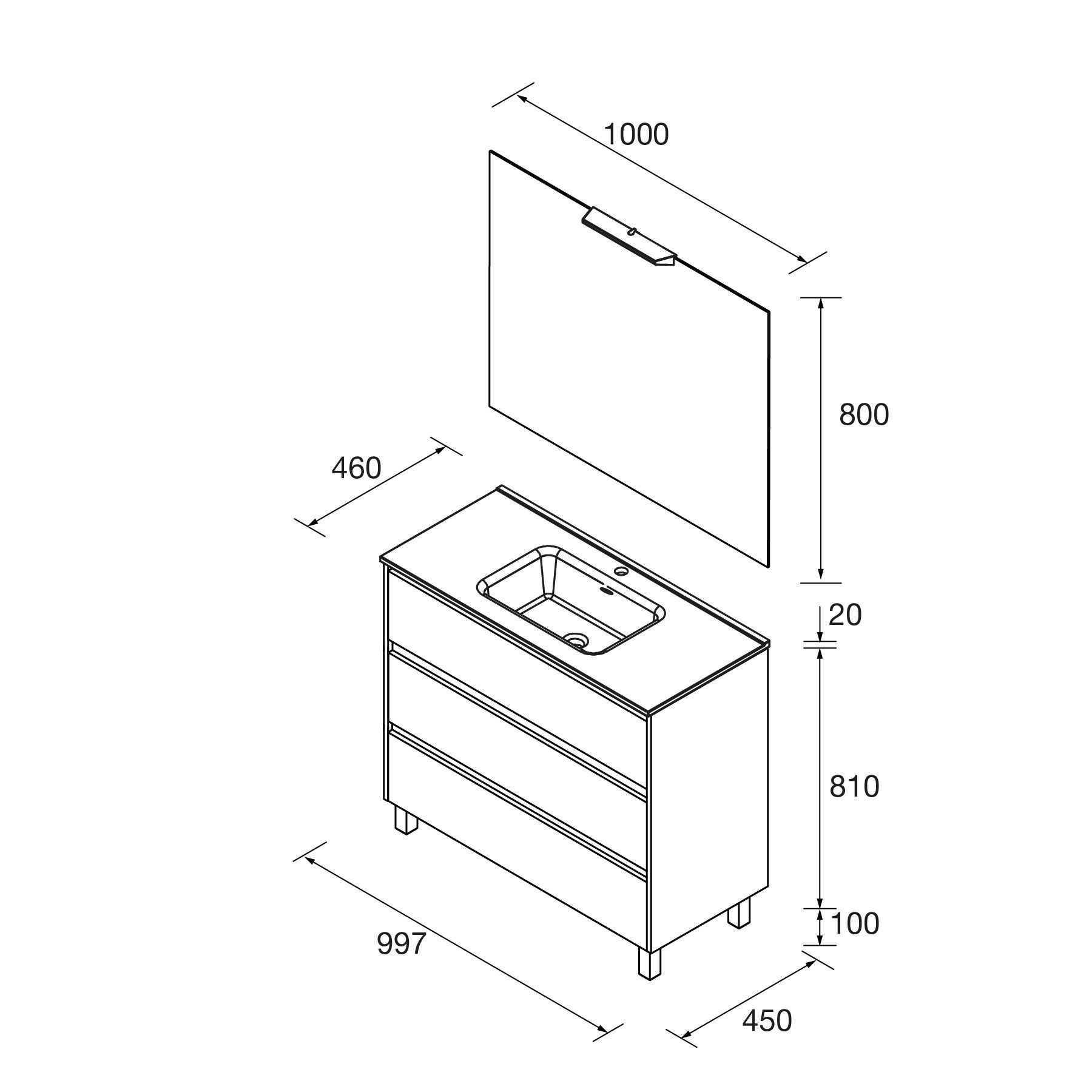 Noja Komplett-Set 1000 3 Schubladen EICHE AFRIKA + Waschtisch + Spiegel + Leuchte