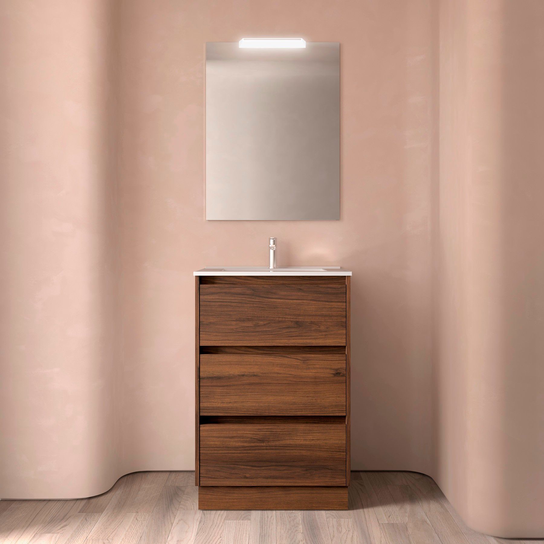 Noja Komplett-Set 600 3 Schubladen Nussbaum MAYA + Waschtisch + Spiegel + Leuchte