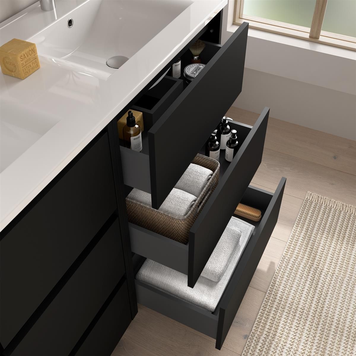 Noja Komplett-Set 800 3 Schubladen BLACK SATIN + Waschtisch + Spiegel + Leuchte