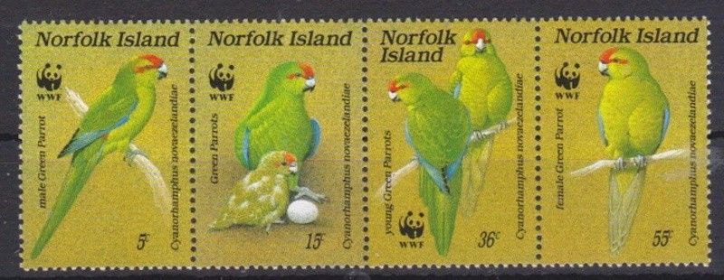 Norfolk-Insel 1987 Viererstreifen MiNr. 421-424 WWF Weltweiter Naturschutz Laufsittich
