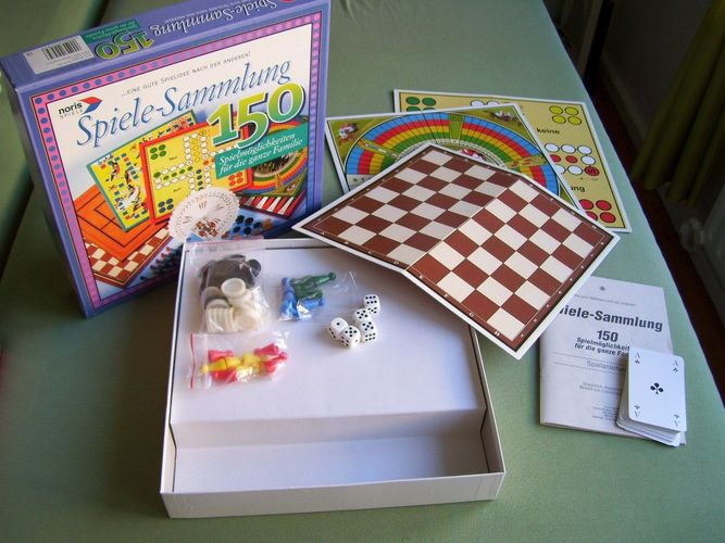 Sie schauen sich hier eine gebrauchte aber noch akzeptabel erhaltene Spielesammlung an von Noris Spiele mit 150 Spielmöglichkeiten s. dann in der Bedienungsanleitung. Für die ganze Familie gedacht. Für das Schachspiel fehlen die Schachfiguren und eine Spielpappe ist in der Mitte über die Hälfte gebr