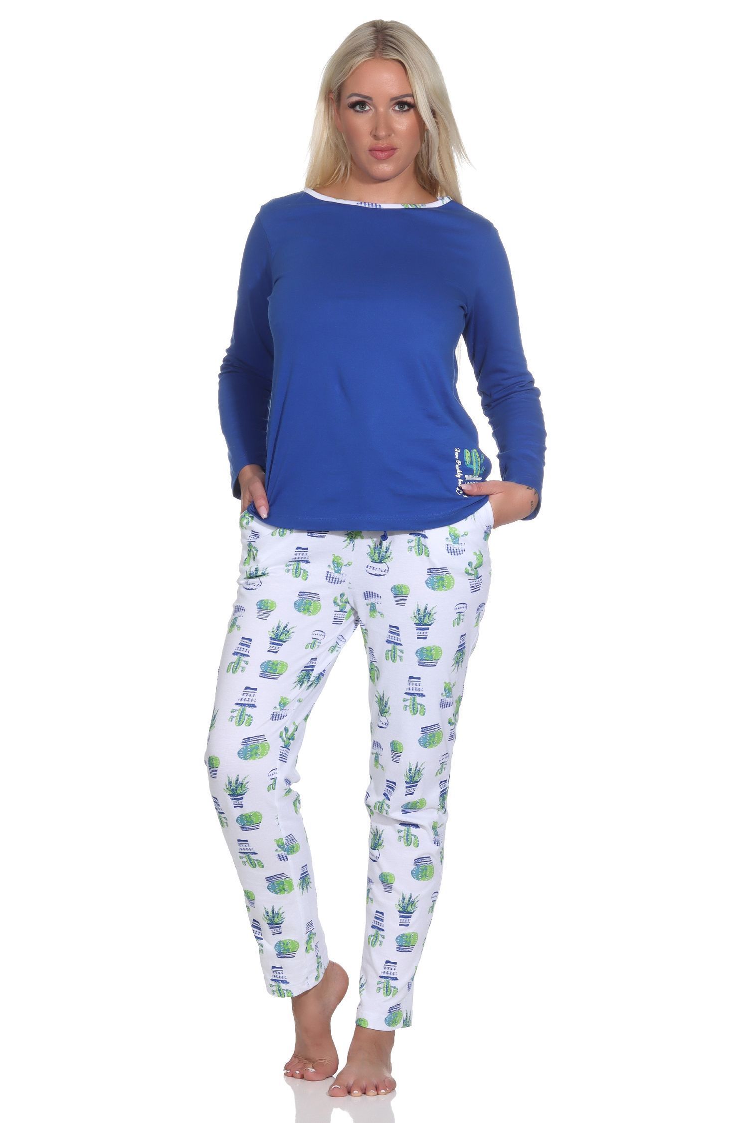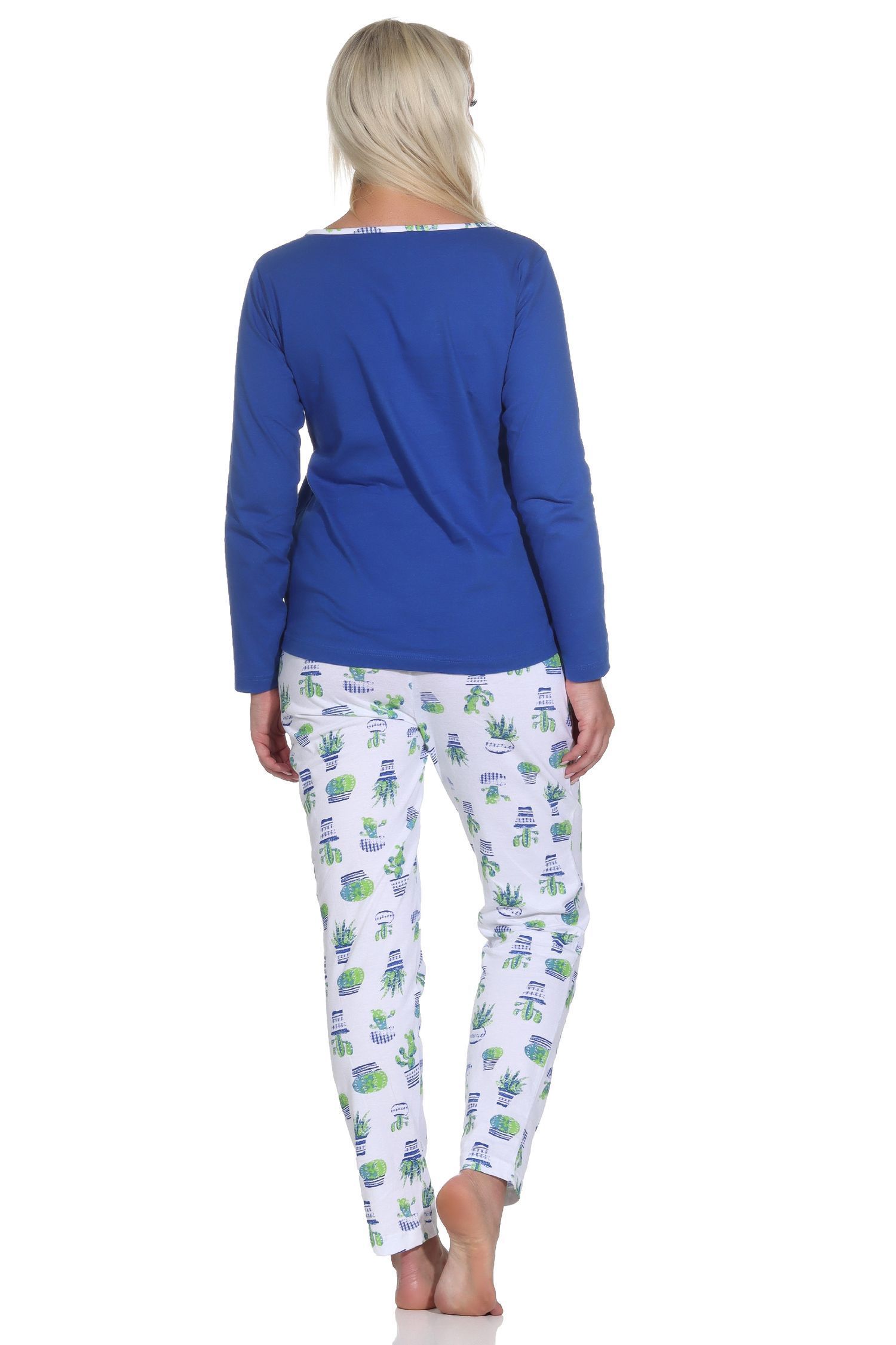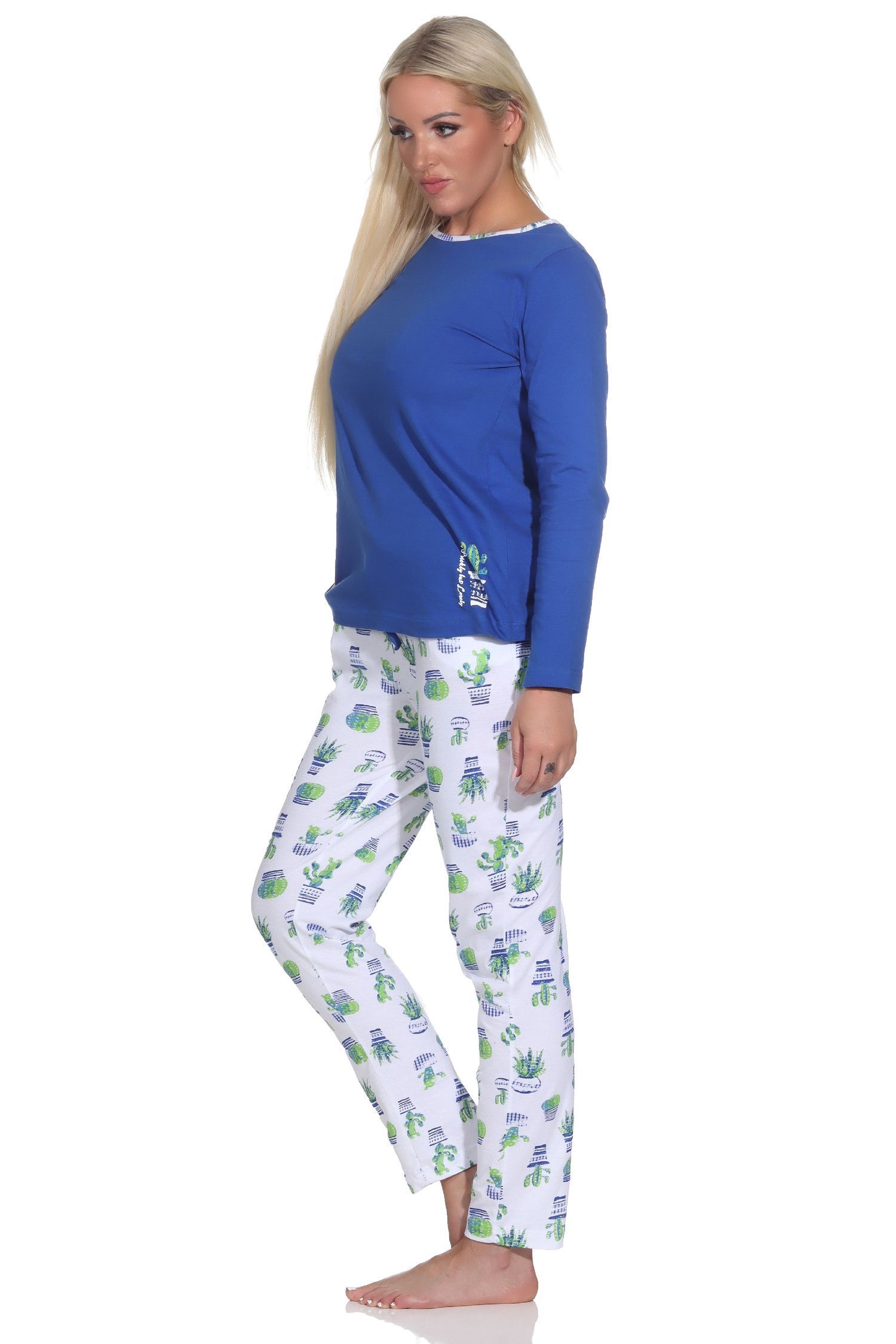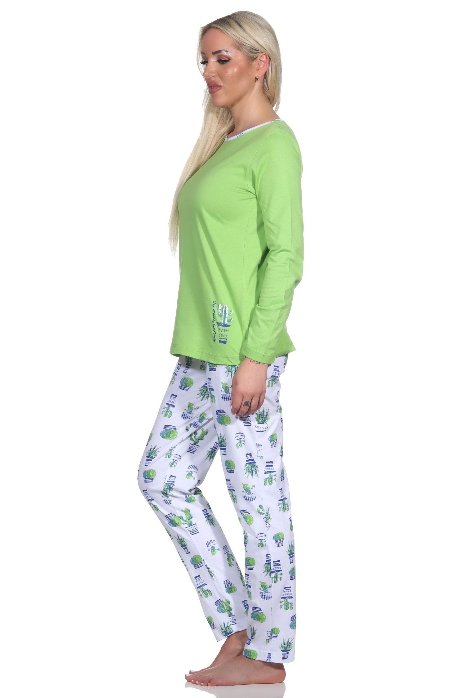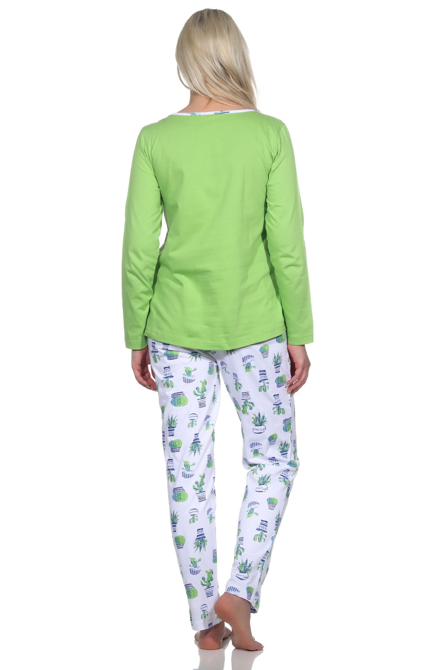 NORMANN Normann Damen Schlafanzug Lang, Oberteil uni mit Kaktus als Motiv