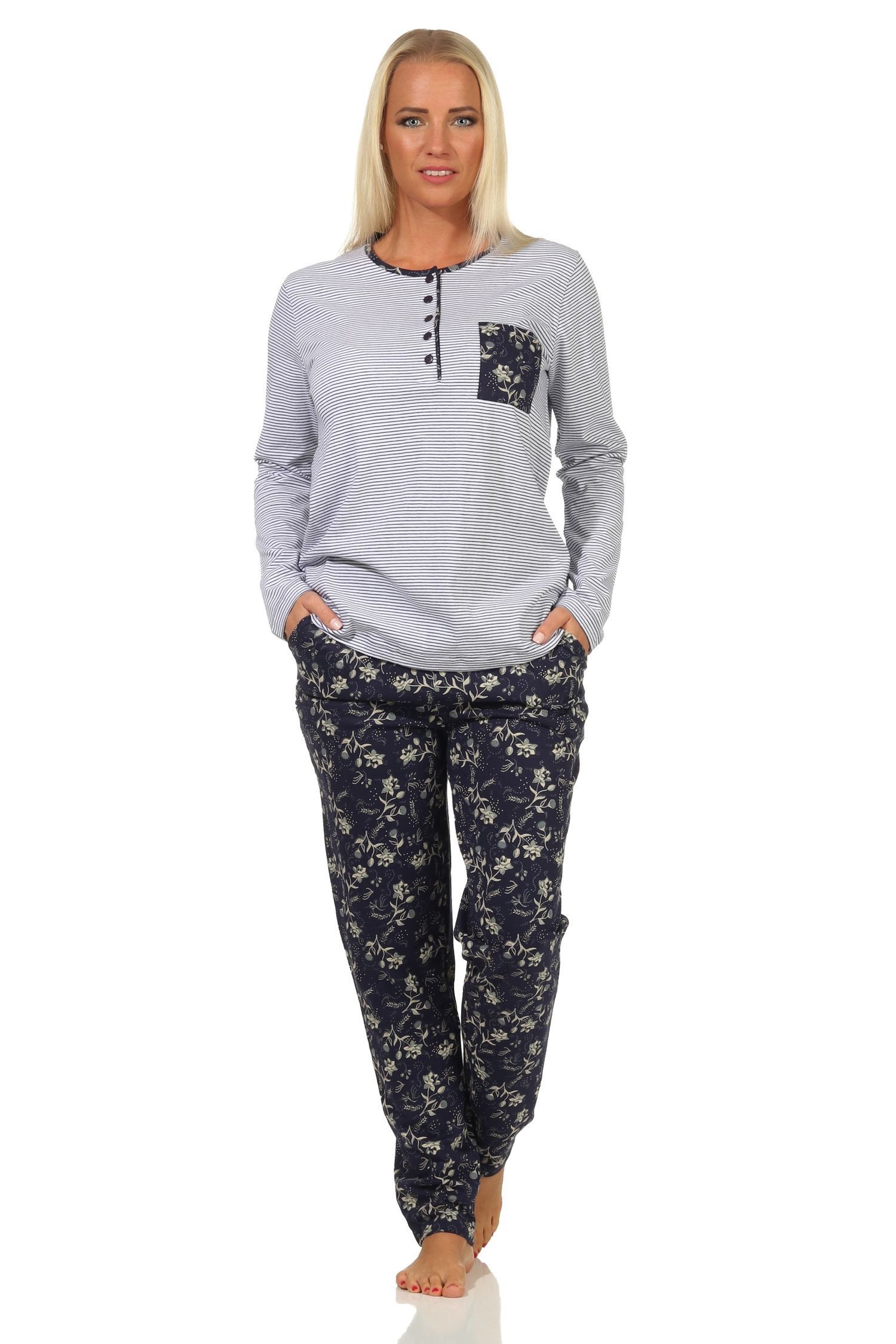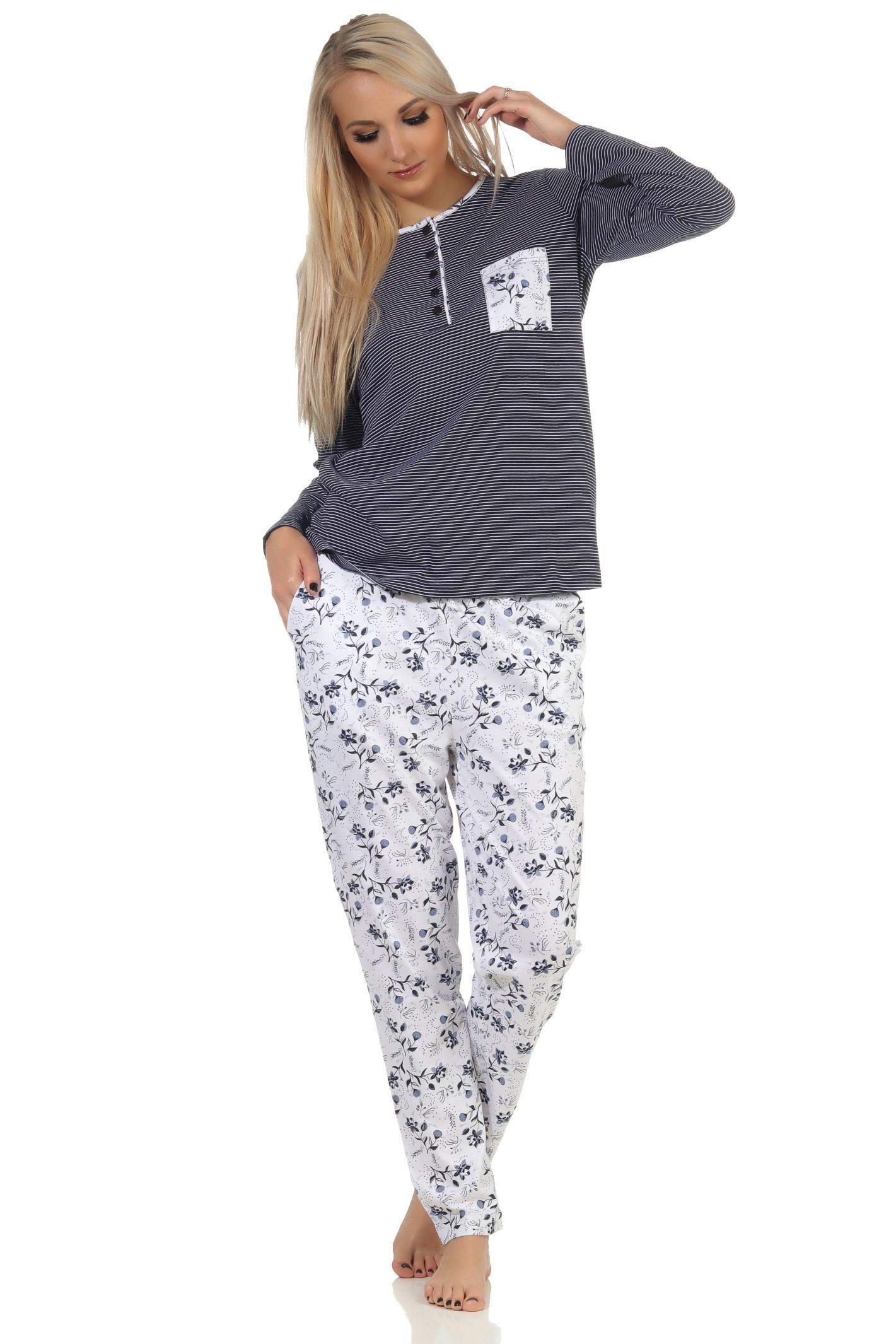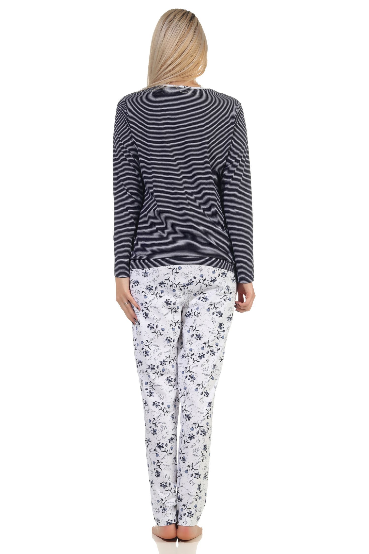Normann Damen Schlafanzug Pyjama lang, Oberteil gestreift, Hose Blümchenmuster