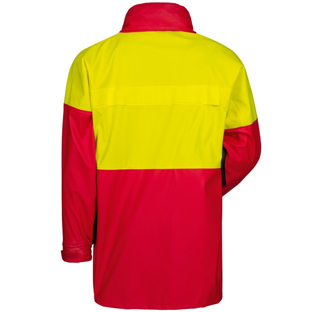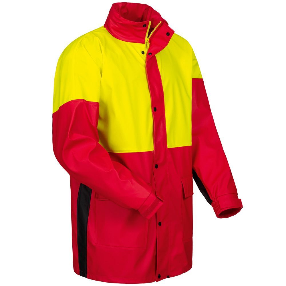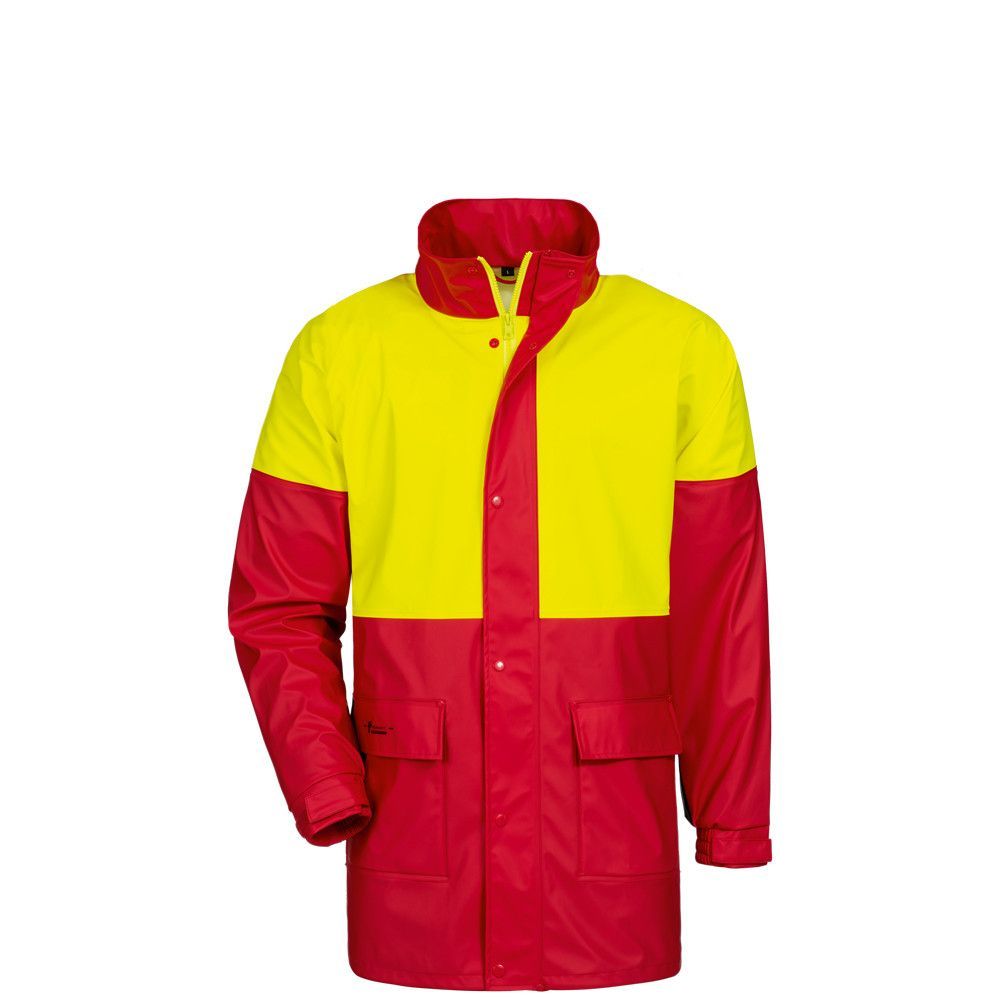 NORWAY PU Regen-Jacke Akazie mit Kapuze rot gelb schwarz Gr. S - 4XL Norm: EN 343 Klasse 3 1 Obermaterial: PU auf Polyester-Trägermaterial, ca. 190 g m² Wassersäule: 8.000 mm Farbe: rot gelb schwarz Größen: S–XXXXL • wind- und wasserdicht, atmungsaktiv • extrem leichtes, geschmeidiges Material • deh