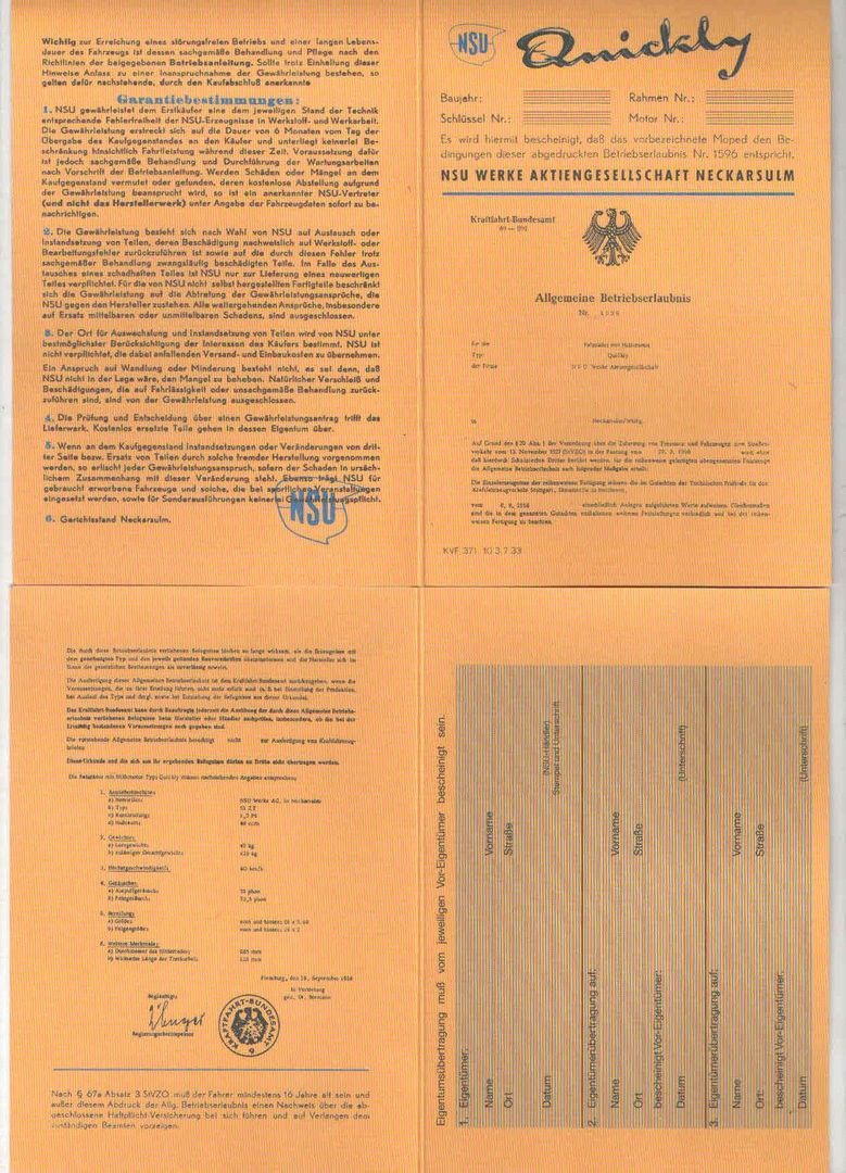 NSU Quickly Betriebserlaubnis, Blanko, Typ 51 TZ, 1956, 1957,1958