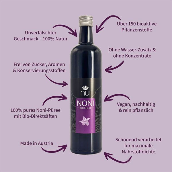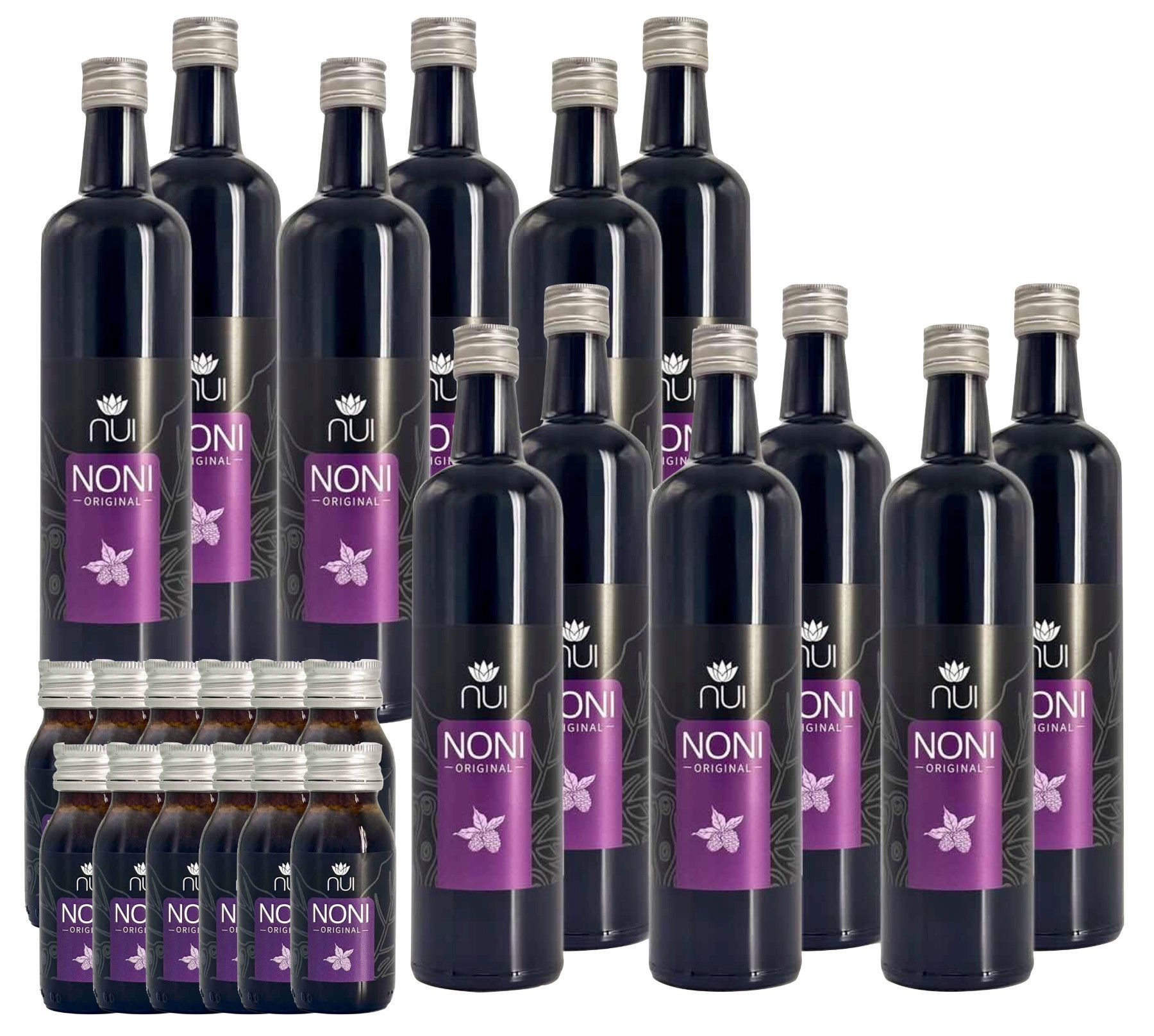 NUI NONI ORIGINAL 12er Pack 12x750ml + 12x 60ml NUI NONI Shot gratis Noni ist ein Kultgetränk mit millionenfach bewährter Qualität. Das fruchtige Getränk auf Basis der wertvollen Noni-Frucht (Morinda citrifolia) ist ideal für alle, die lange ein aktives, gesundes Lebensgefühl genießen wollen.