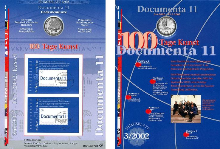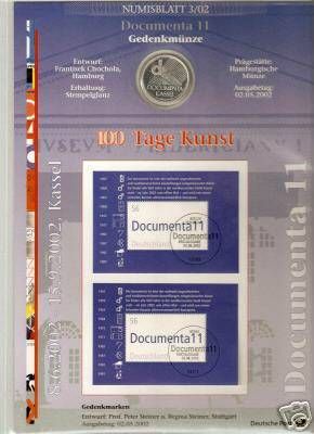 Numisblatt Nr. 20, DOCUMENTA 2002 in Kassel, 10 EURO in Normalprägung mit Briefmarkenkleinbogen und Ersttagsstempel, Schön 216, J. 492