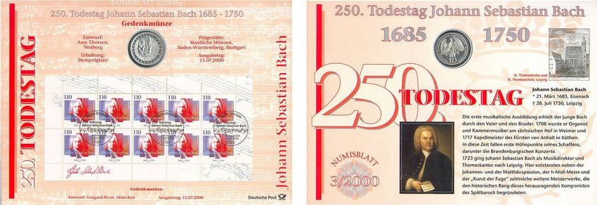 Numisblatt Nr. 3, Johann Sebastian BACH 10 DM in Normalprägung mit Briefmarken-Kleinbogen und Ersttagsstempel,