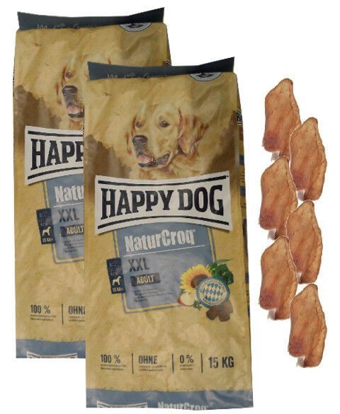 NUR HEUTE ! 2x15kg Happy Dog Naturcroq XXL Adult Hundefutter + 6 Kaninchenohren