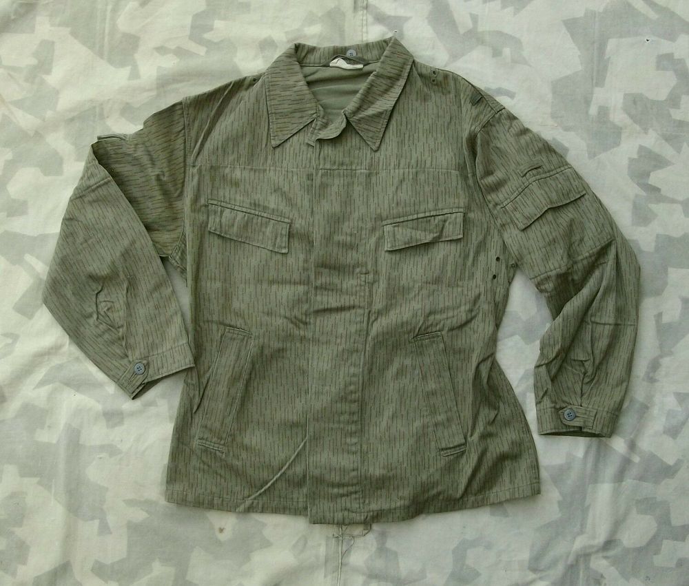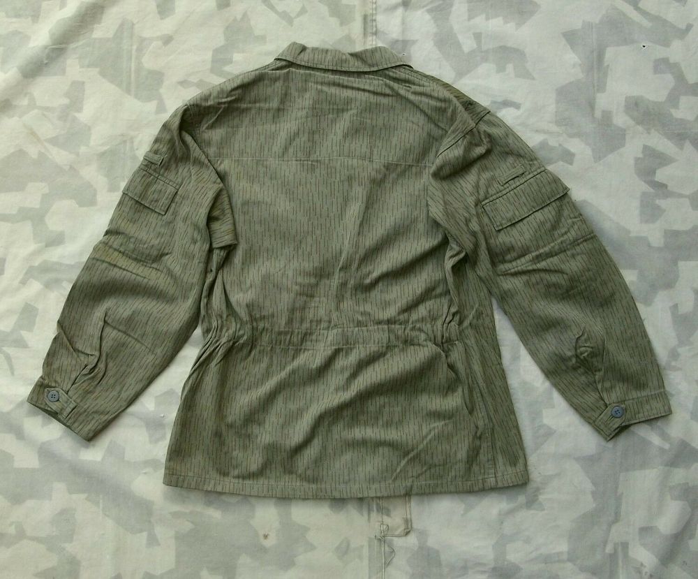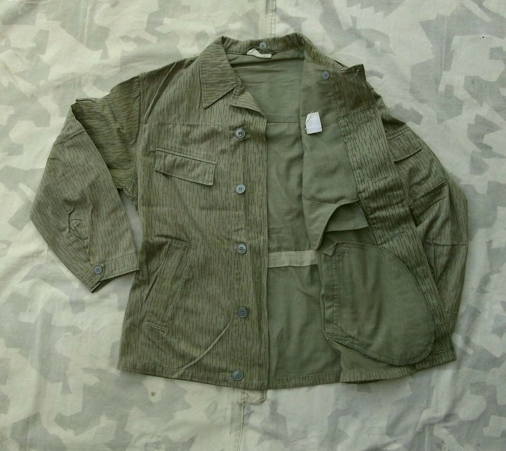 NVA Feldjacke 4 Taschen Original Feldjacke der NVA aus alten Armeebeständen. Gebrauchte Tarnjacke ein Strich kein Strich (strichtarn). Material: Baumwolle Polyester. Gebraucht, Zustand: 2, NVA Größe: k48. Zwei Brusttaschen mit Patten Zwei Einschubtaschen Zwei Oberarmtaschen mit Patten Knopfleiste mi