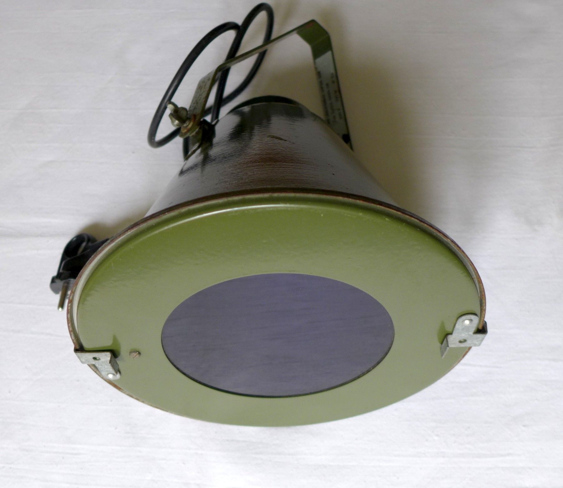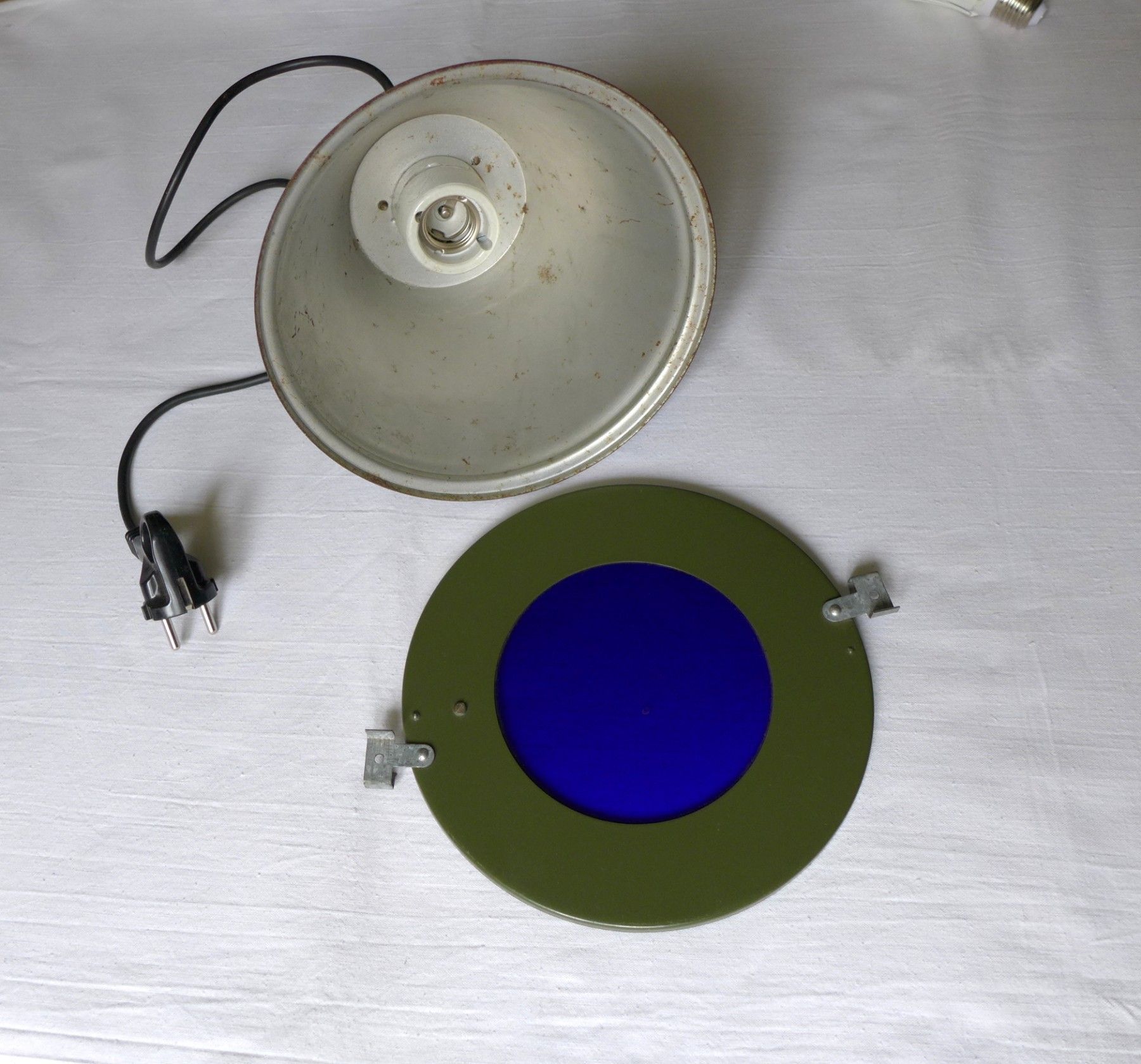gebrauchter Zustand mit Gebrauchs - und Lagerspuren siehe Fotos , die Leuchte kann ohne die zusätzliche Blaulichtscheibe Tarnlichtscheibe verwendet werden , Porzellanfassung E 27 , max. 100 W , 250 V , Kabel mit Stecker Länge ca. 75 cm , Höhe mit Bügel ca. 26 cm , Durchmesser ca. 21 cm , brennt , da