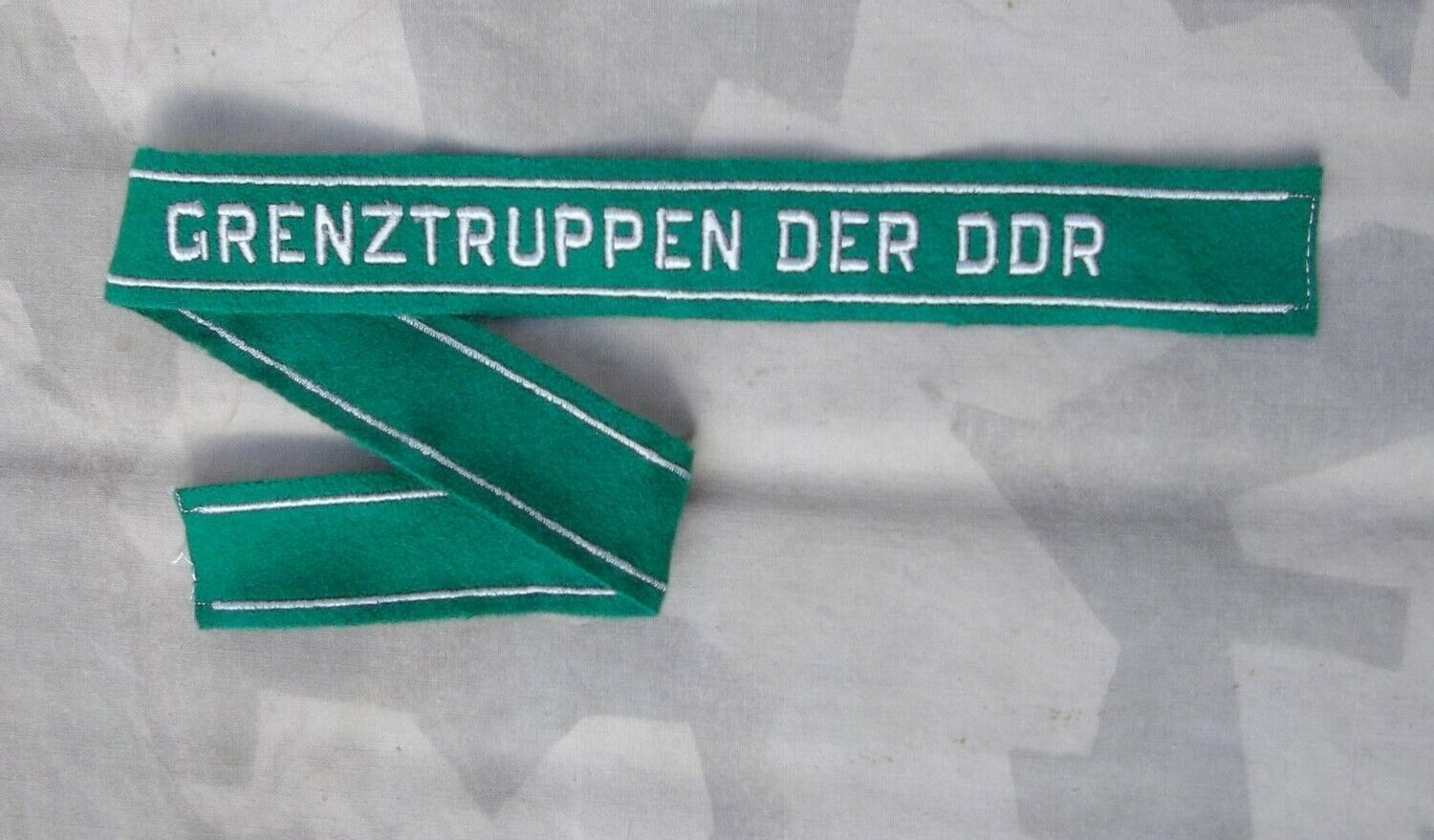 Ärmelband Grenztruppen der DDR Original Ärmelband der NVA. Gestickt mit silbergrauem Faden auf grünem Wollfilz. Länge ca. 44,5 cm, Breite ca. 3 cm.