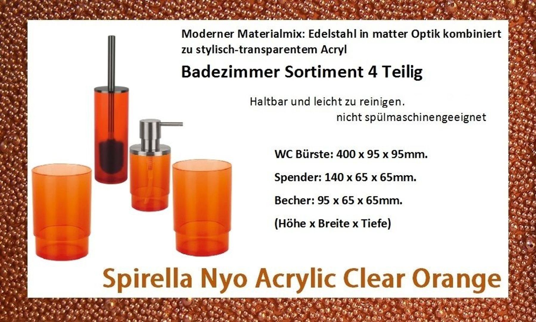 ***Achtung: es handelt sich um Artikel ohne Originalverpackung und kann auf Grund der empfindliche Oberfläche Kratzer enthalten. Alle Artikel sind neu und voll funktionsfähig. Reduziert von UVP!!*** PRODUKTBESCHREIBUNG: NYO Acrylic Orange 4 Teilige Badset besteht aus: WC Bürste, Seifenspender, 2 x Z... Mehr