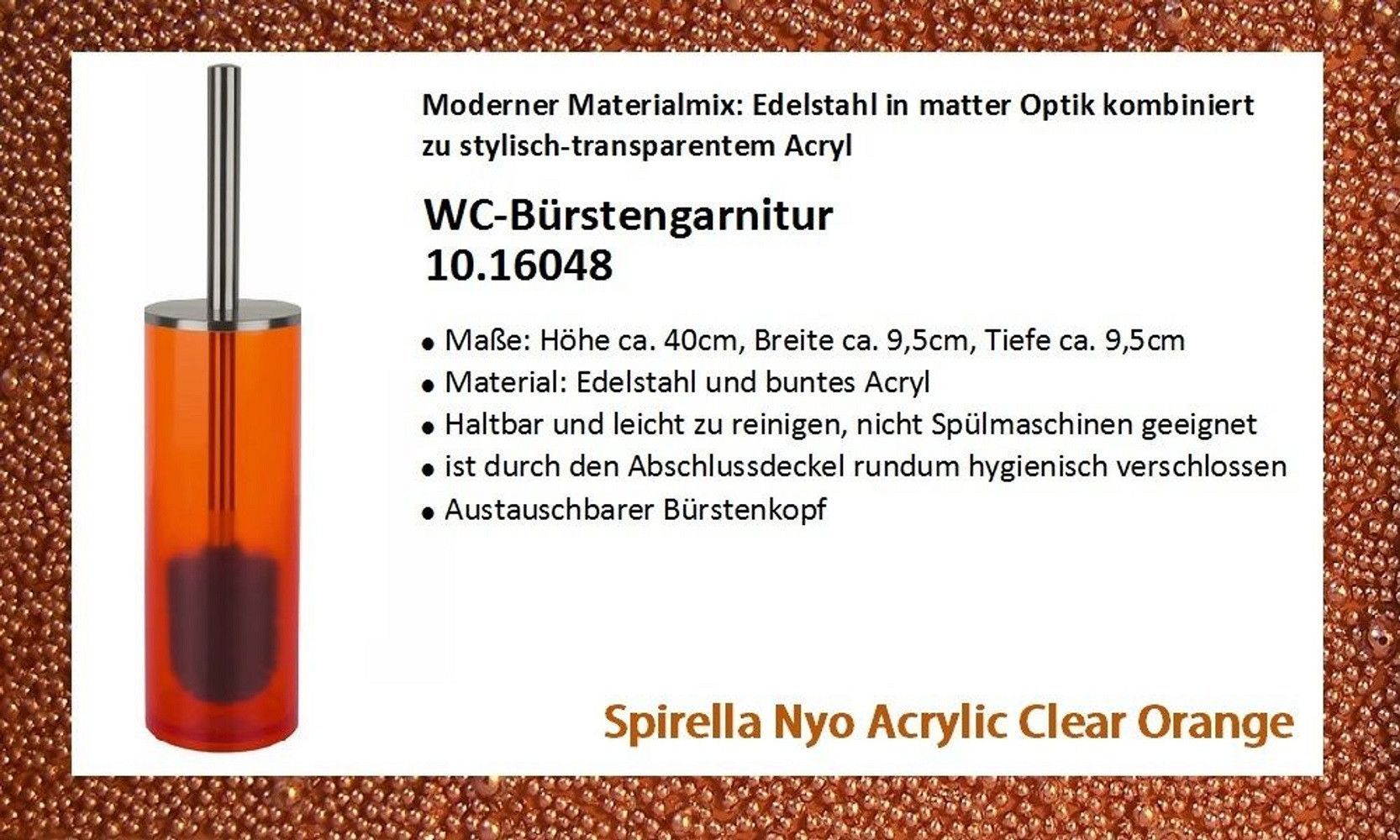 ***Achtung: es handelt sich um Artikel ohne Originalverpackung und kann auf Grund der empfindliche Oberfläche Kratzer enthalten. Alle Artikel sind neu und voll funktionsfähig. Reduziert von UVP!!*** PRODUKTBESCHREIBUNG: Spirella NYO Orange Toilettenbürste. Warme Transparenz in edlem Orange. Material... Mehr
