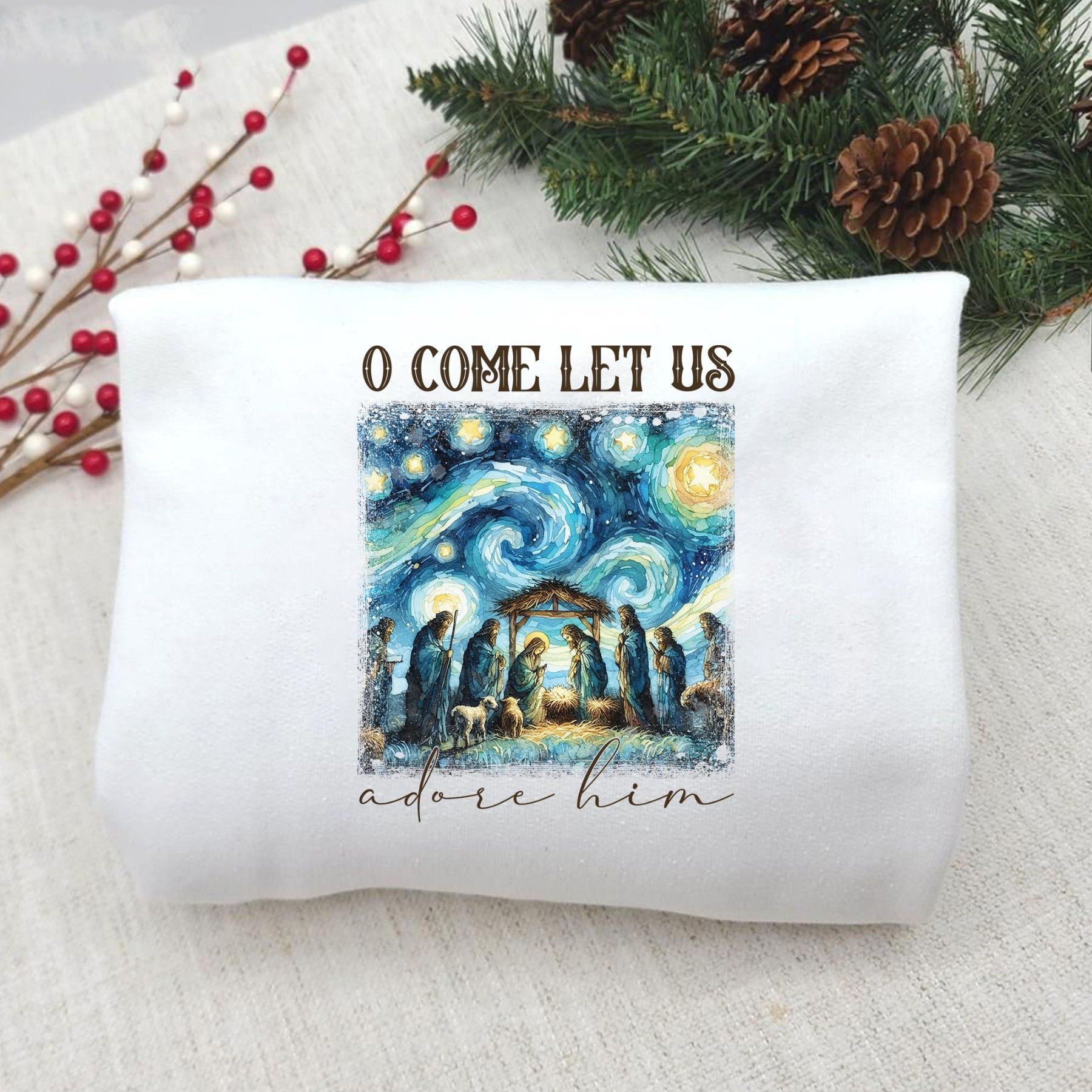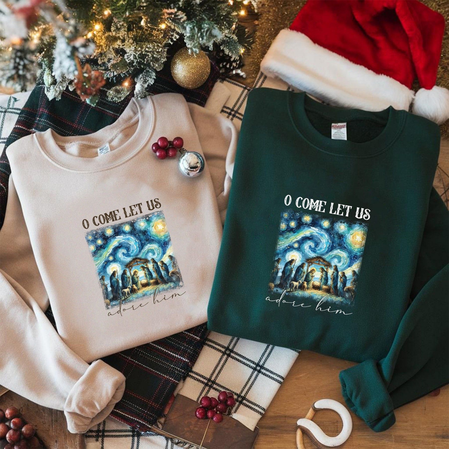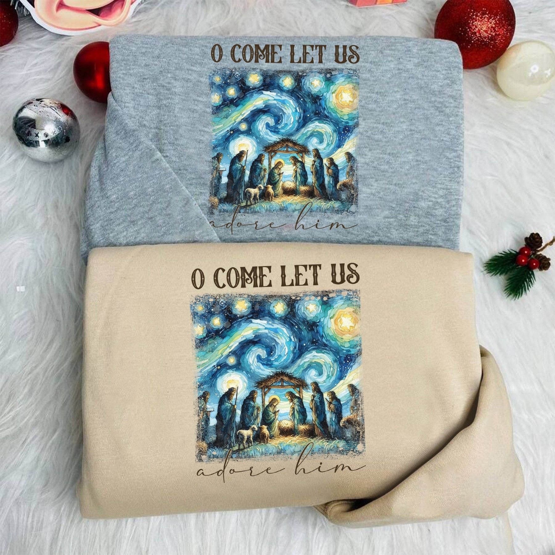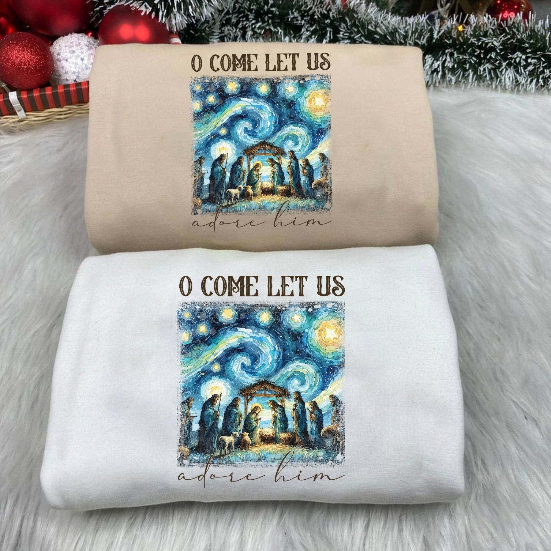 O Come Let Us Adore Him Sweatshirt, Christliches Weihnachts T-Shirt, Jesus Geburt Pullover, Heilige Nacht Shirt, Krippenszene Design Unser O Come Let Us Adore Him Sweatshirt zeigt eine wunderschöne Krippenszene inspiriert von der berühmten Sternennacht EuroEuro Dieses Design verbindet Kunst und Glau