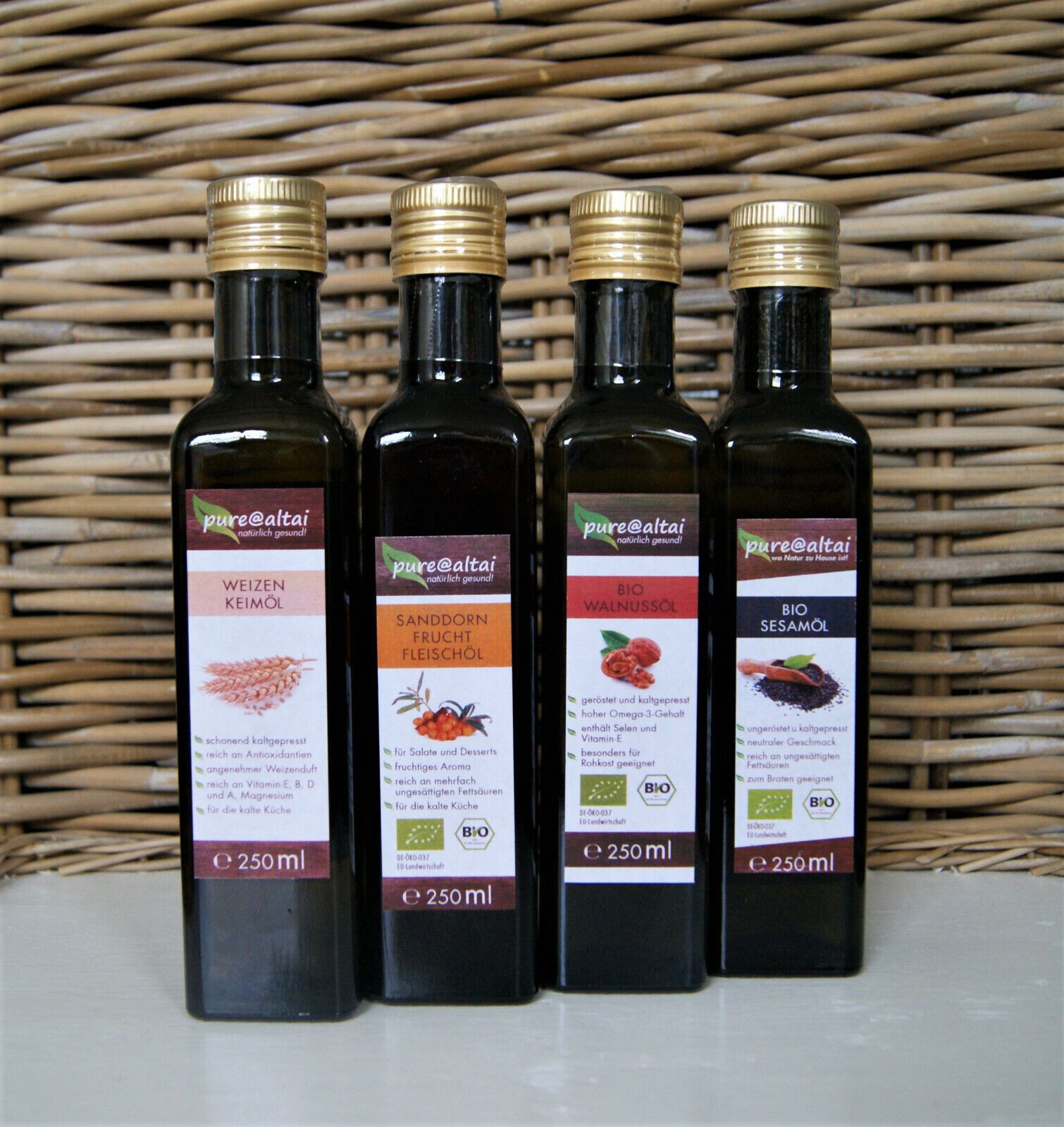 Öl-Paket sanft mit Sanddorn-, Weizenkeim-, Walnuss- und Sesamöl – je 250ml