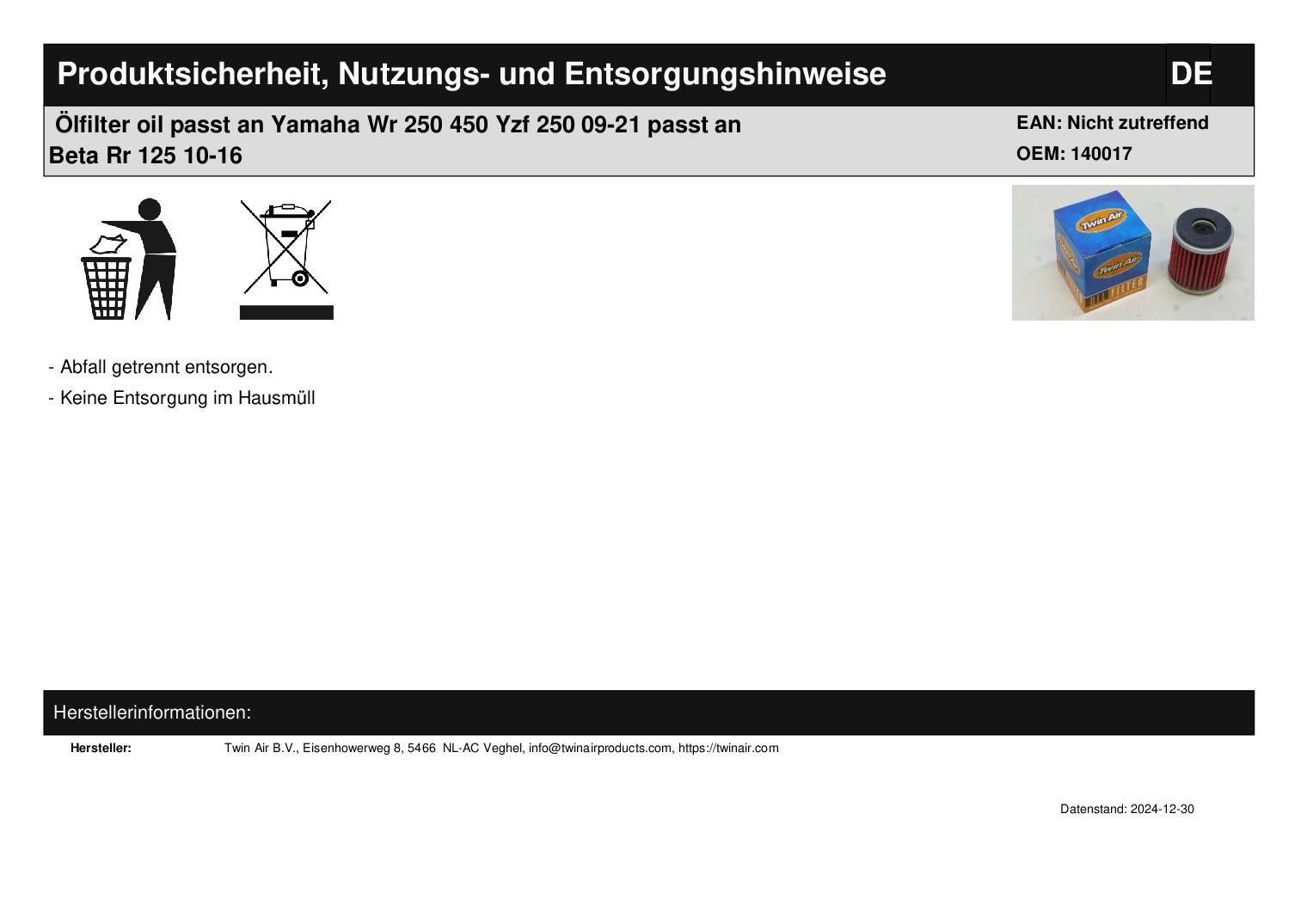 Ölfilter oil passt an Yamaha Wr 250 450 Yzf 250 09-21 passt an Beta Rr 125 10-16