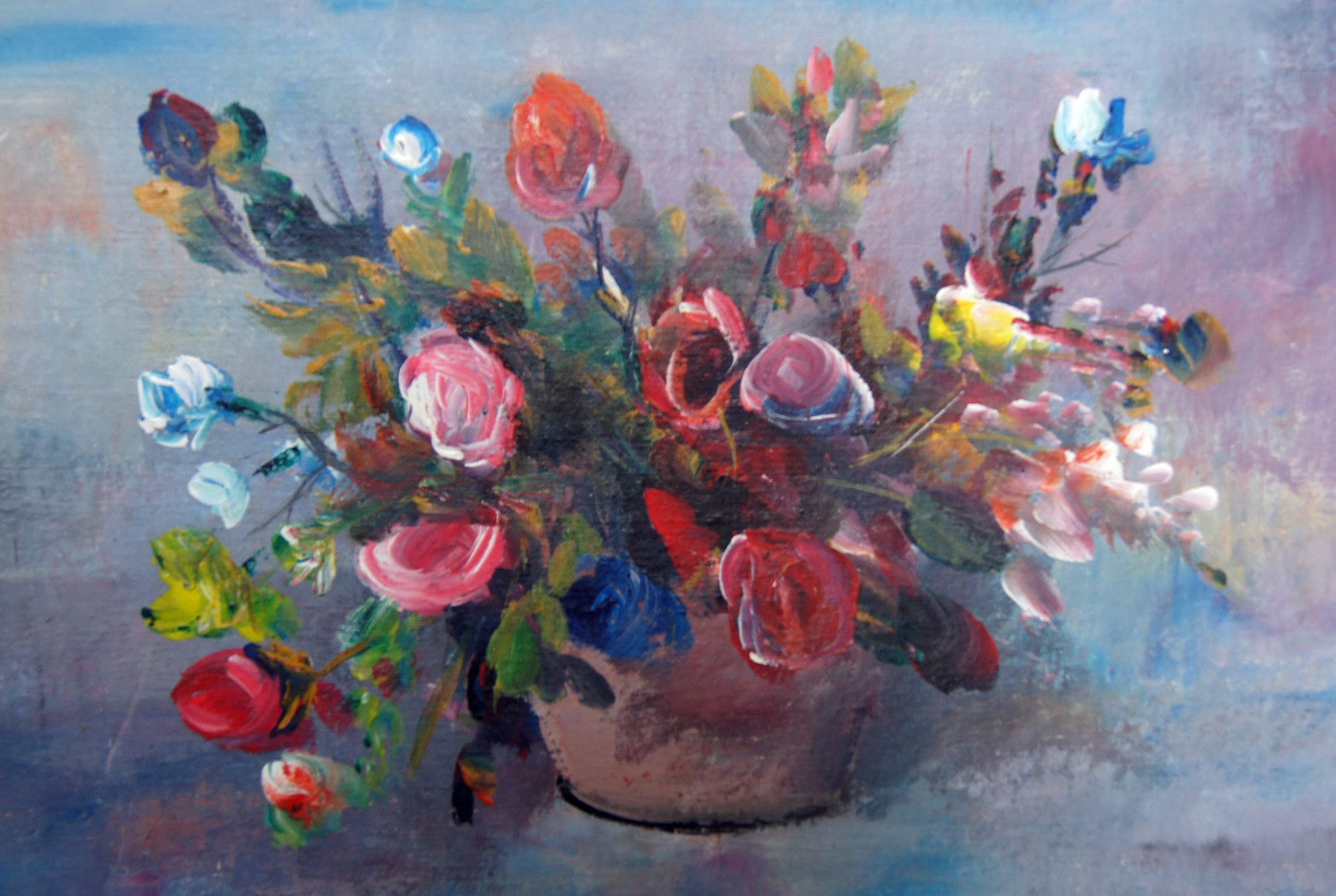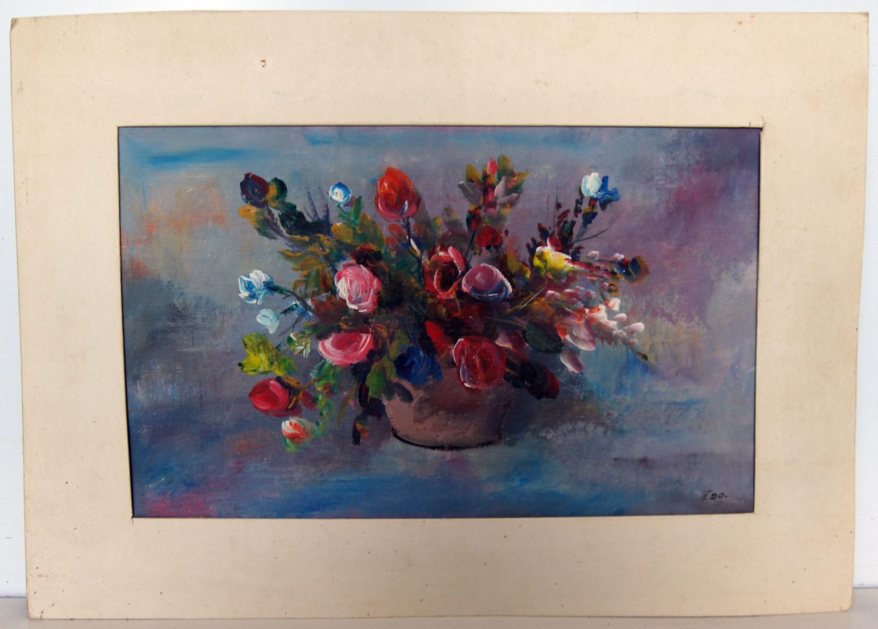 Ölgemälde auf Pappe Monogrammiert: EDO . Motiv: Blumen. Das Bild kommt ohne Rahmen. Maße: H 41, B 584 cm. Antikes am Deich - Inh: Oliver Kipp-Trense