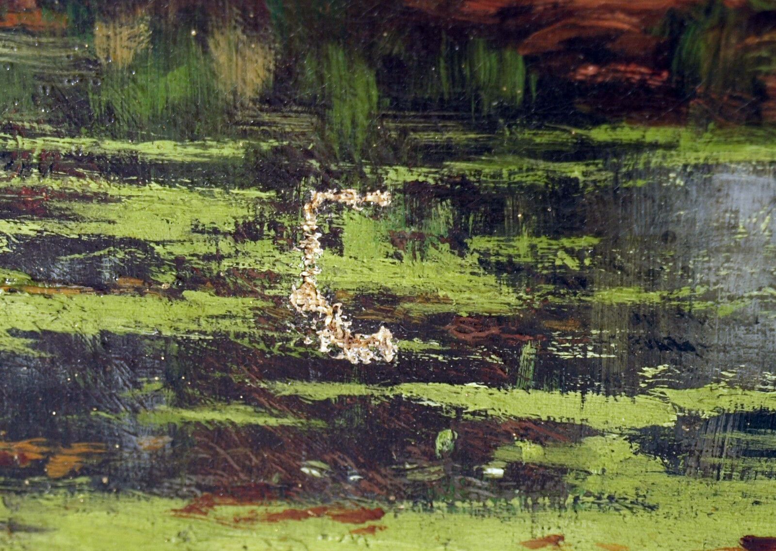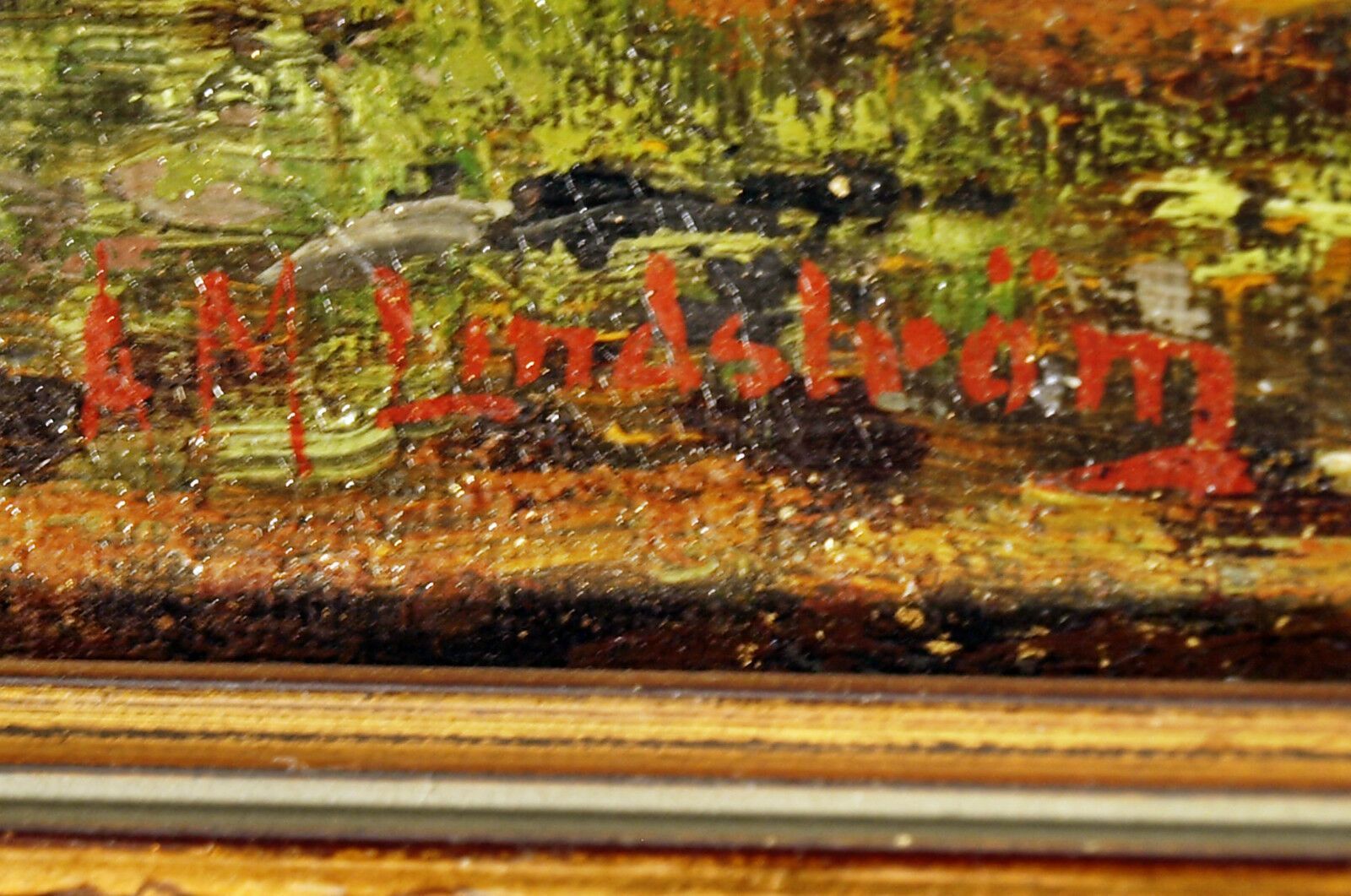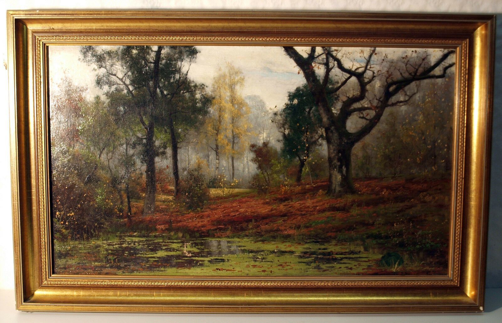 Ölgemälde um 1900 gemalt auf Leinwand, im Goldrahmen, signiert: A M Lindström (Arvid Maurits Lindström, schwedischer Landschaftsmaler, 1849 - 1923, gelebt in London, Stockholm, München. Verzeichnet bei: Thieme-Becker, Vollmer, Boetticher, Bénézit, Müller-Singer). Motiv: Landschaft am See. Vier klein