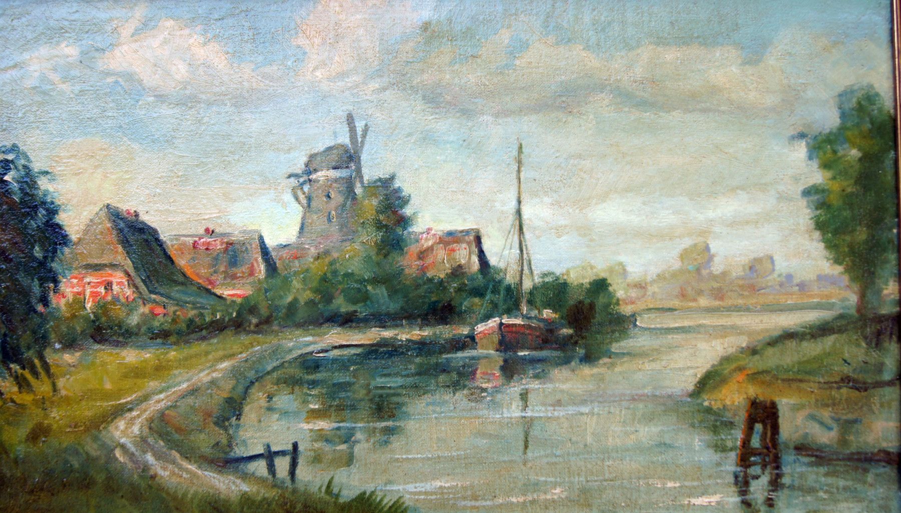Ölgemälde auf Leinwand um 1930. Unsigniert . Motiv: Die Este bei Buxtehude . Maße: Rahmen H 39, B 64 cm. Antikes am Deich - Inh: Oliver Kipp-Trense