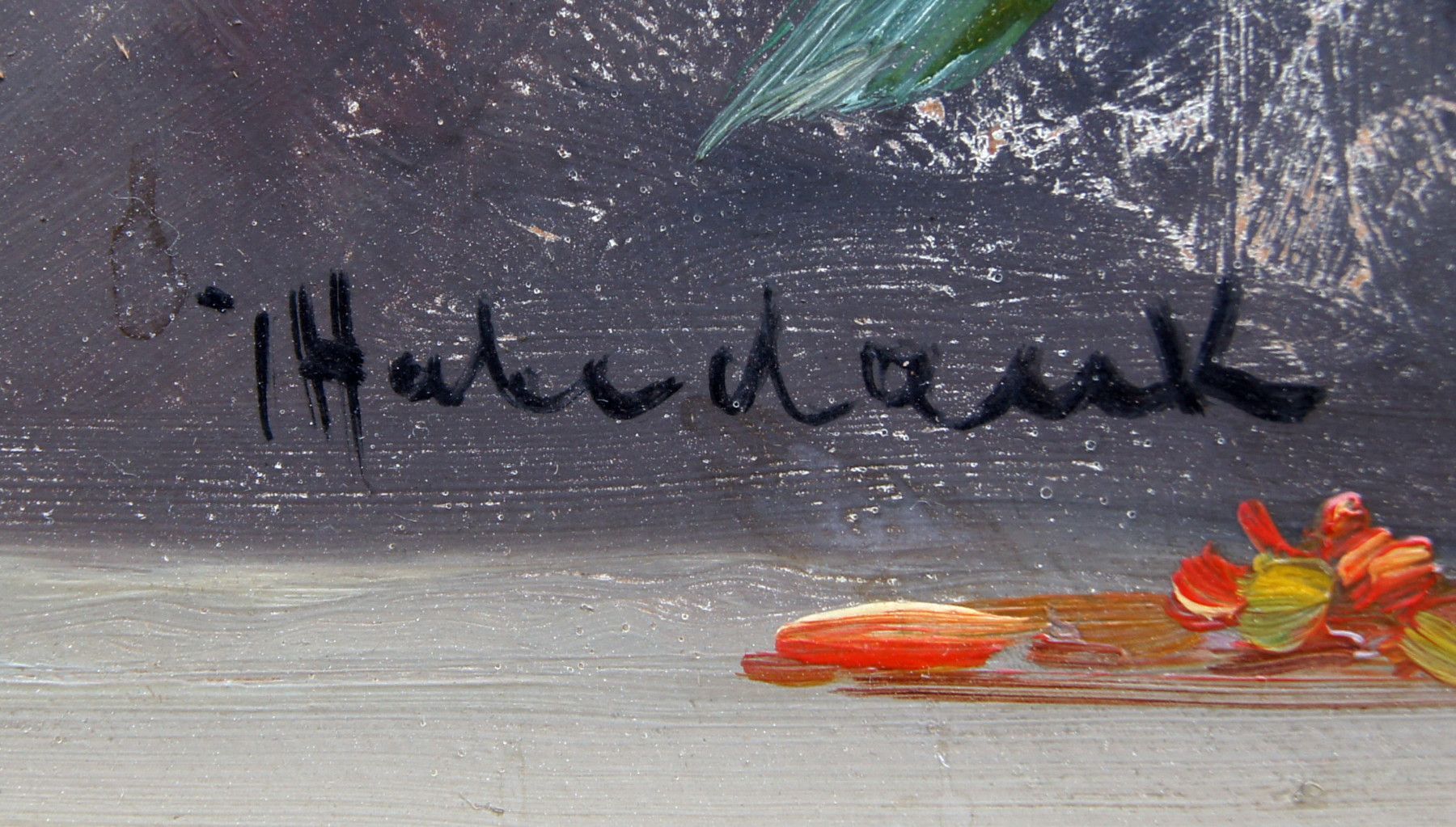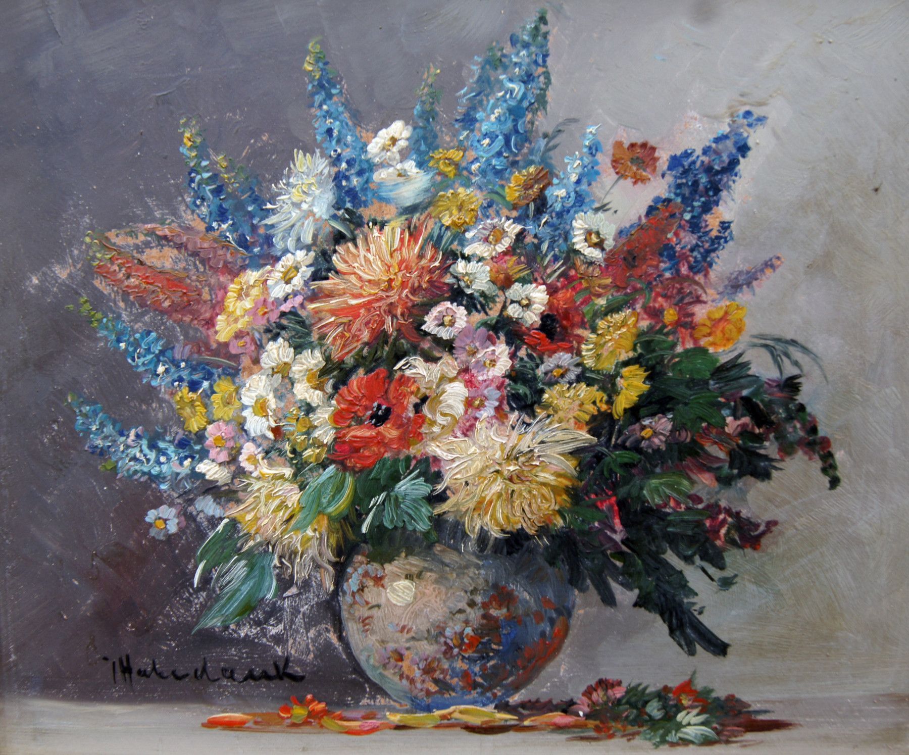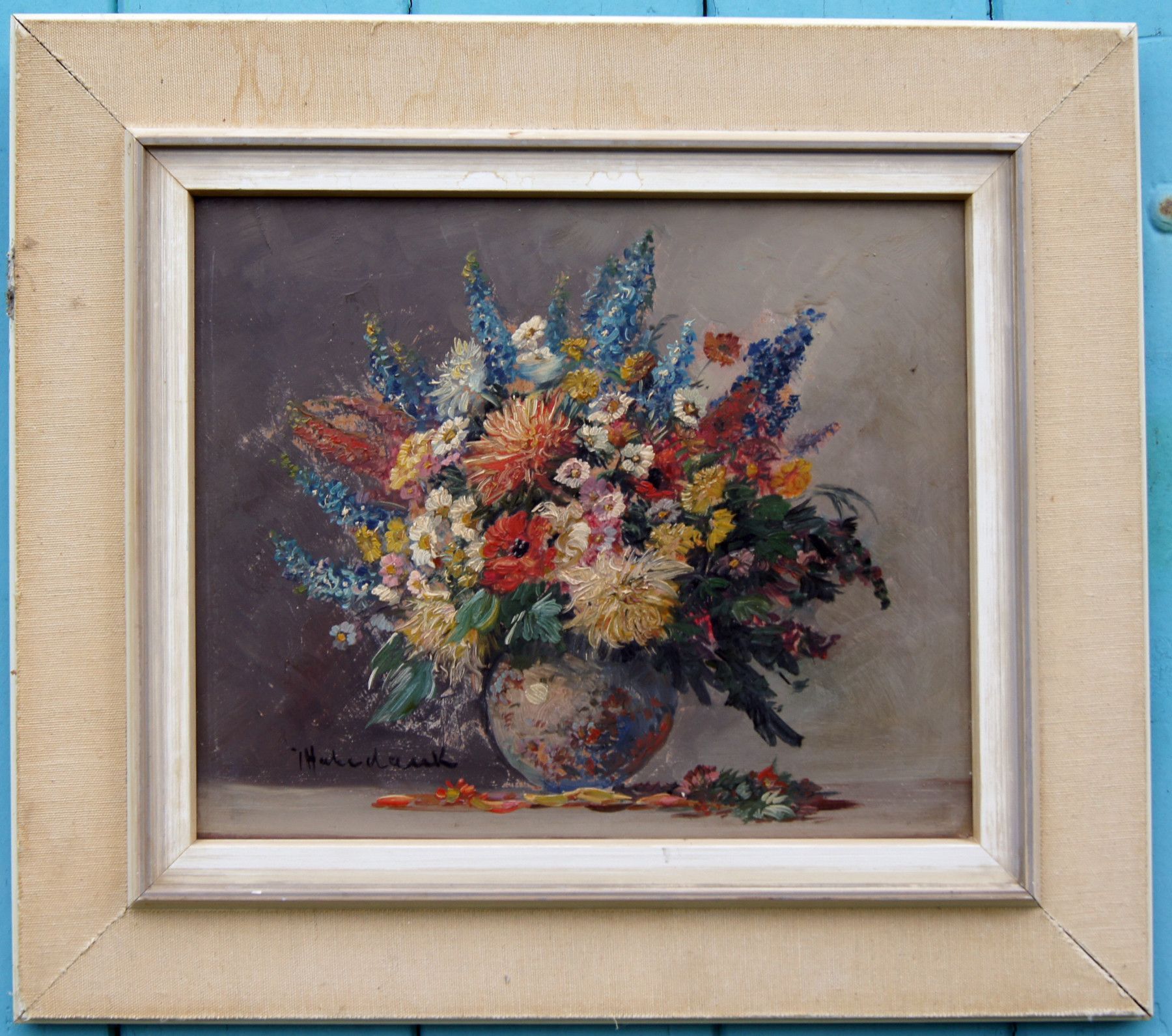 Ölgemälde auf Malpappe um 1970. Signiert: I.Habedank. Motiv: Blumenstilleben . Maße: Rahmen H 39, B 44 cm. Antikes am Deich - Inh: Oliver Kipp-Trense