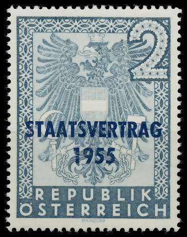 ÖSTERREICH 1955 Nr 1017 postfrisch 2S Wert Ausgabe Staatsvertrag 1955 1.09€ incl. MwSt: Differenzbesteuert zzgl. Versandkosten Bestell-Nr.: 75E96E Katalog-Nr: MICHEL (1017) Katalogpreis: 3 EUR Qualität: Normal Erhaltung: Postfrisch ** Einheit: Einzelmarke Einzelstück Bogenlage: Gummierung: Gepr