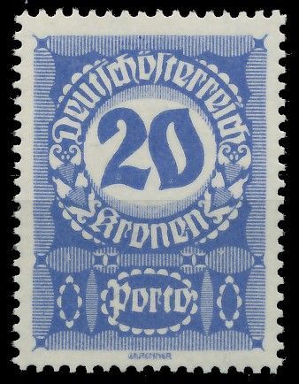 ÖSTERREICH PORTOMARKEN 1920 21 Nr 92x postfrisch 20 Kr Wert aus der Ausgabe Portomarken Ziffernzeichnung in rundem weißen Hintergrund, weißes Papier 1.09€ incl. MwSt: Differenzbesteuert zzgl. Versandkosten Bestell-Nr.: A0D7D2 Katalog-Nr: MICHEL (92 x) Katalogpreis: 2 EUR Qualität: Normal Erhalt