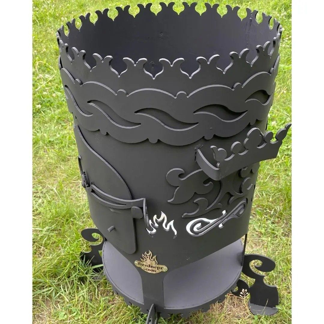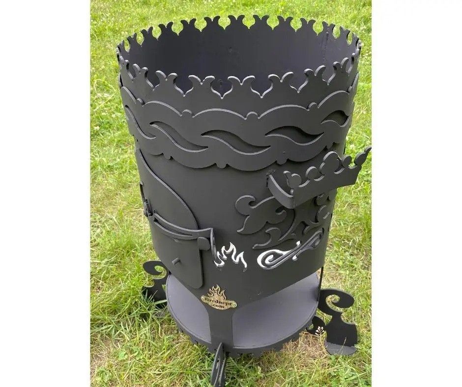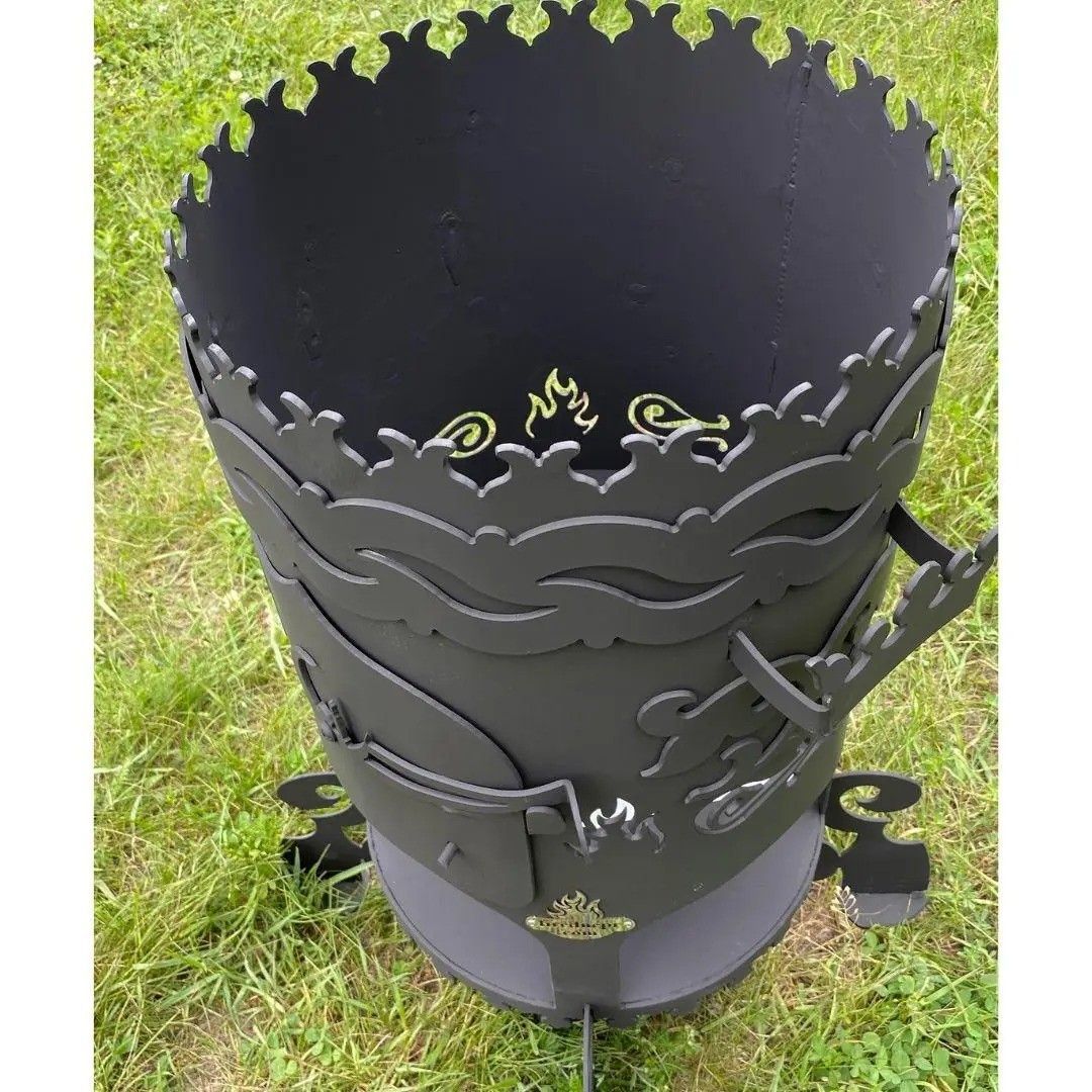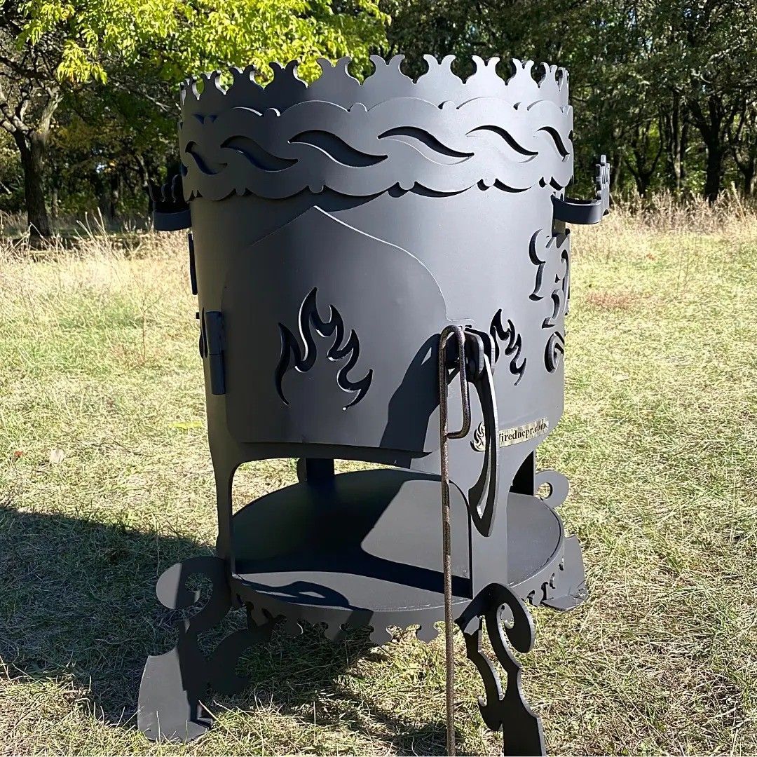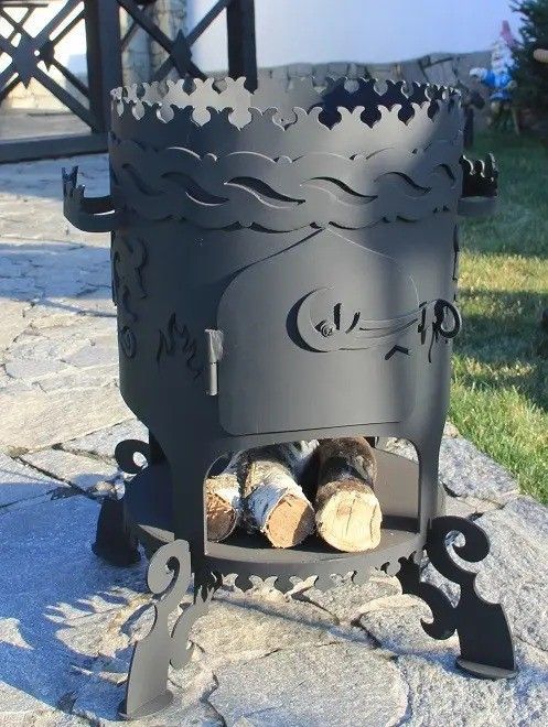 Bukhara-2 Ofen – robuster Outdoor-Ofen für Asiatische Kessel bis 12 Liter (Ø 40 cm). Gefertigt aus 4 mm Stahl, mit integrierter Brennholzablage. Der Kessel sitzt halb in der Öffnung – für stabiles Garen mit Rauchgeschmack. Höhe: 67 cm