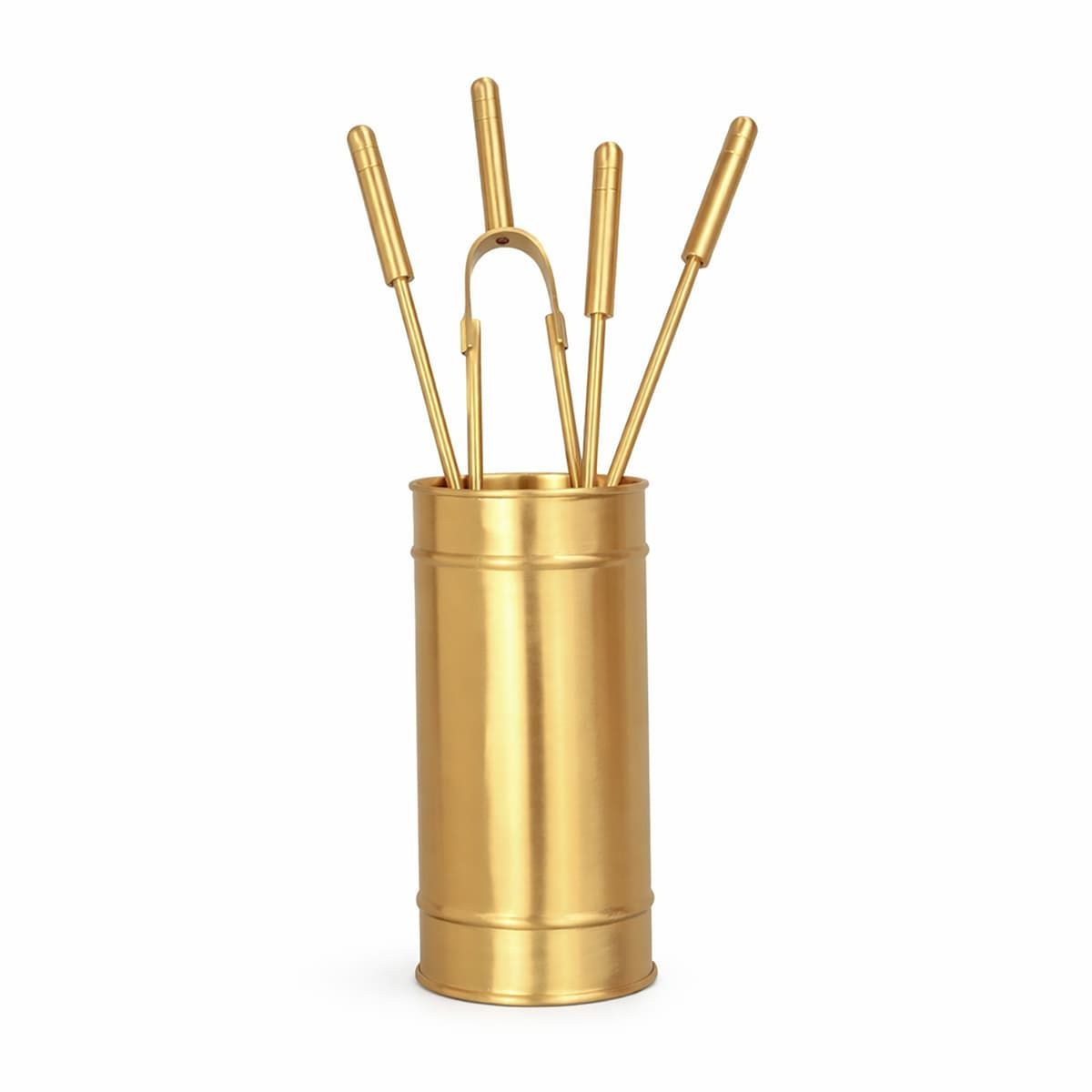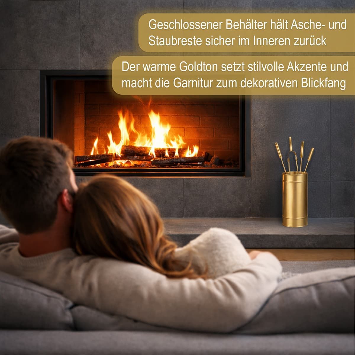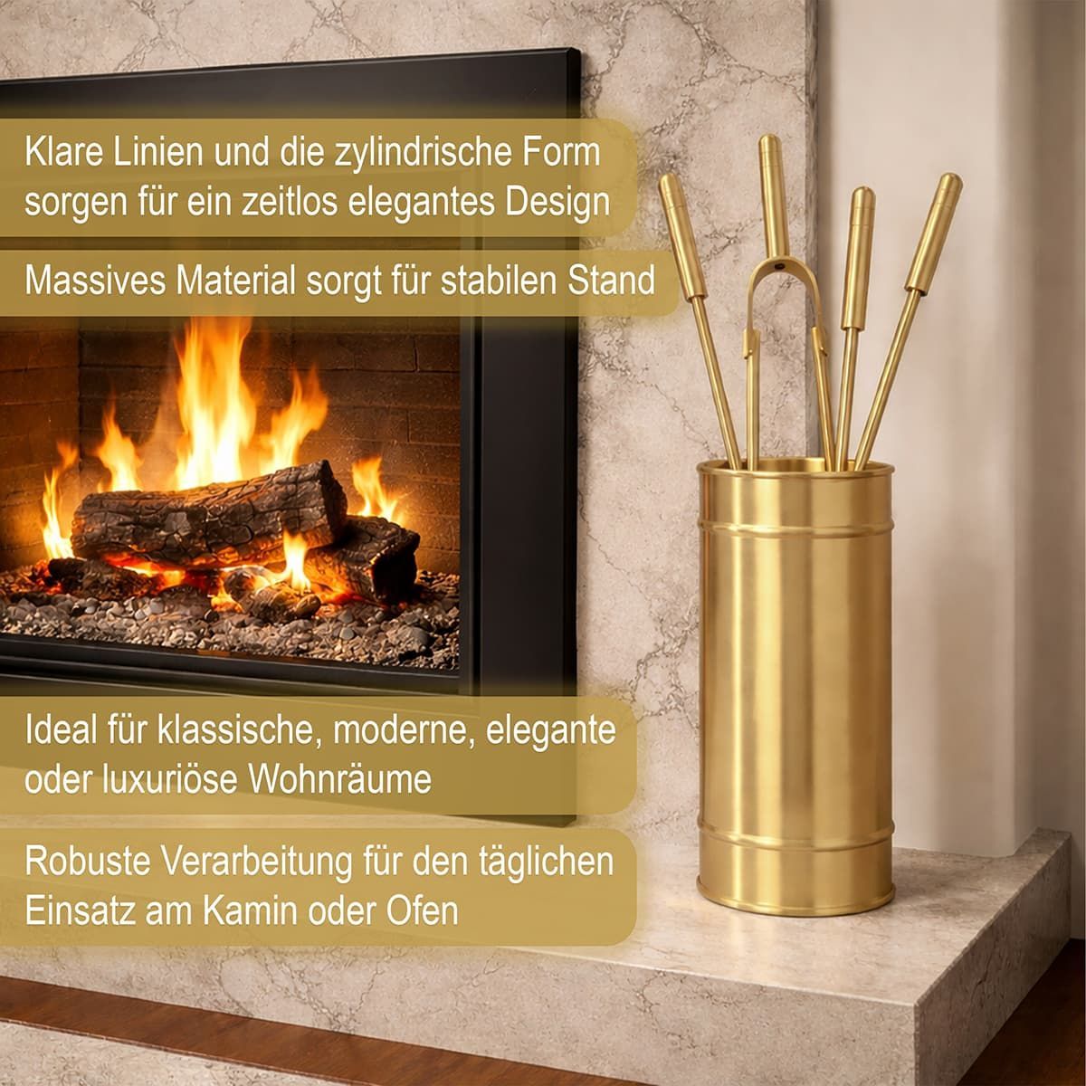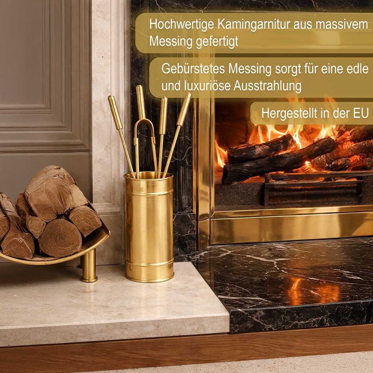 Ofenbesteck Messing gebürstet mit geschlossenem Behälter - Kaminbesteck Ofenset