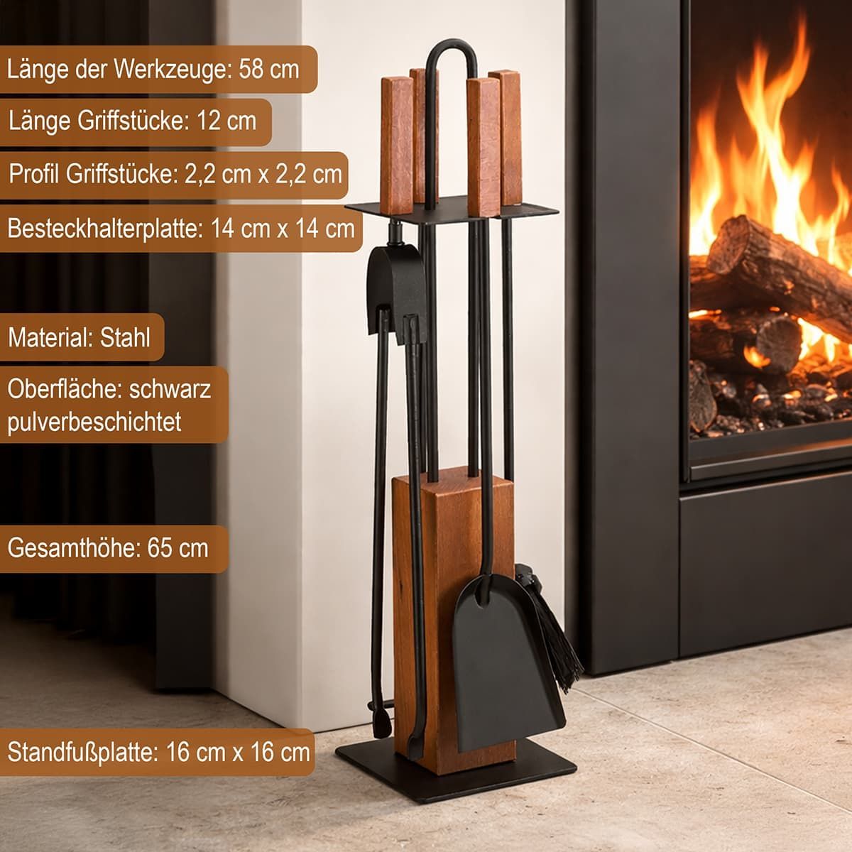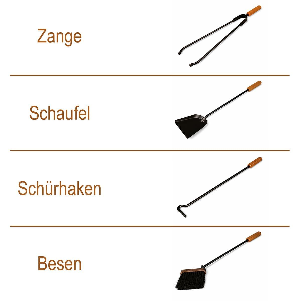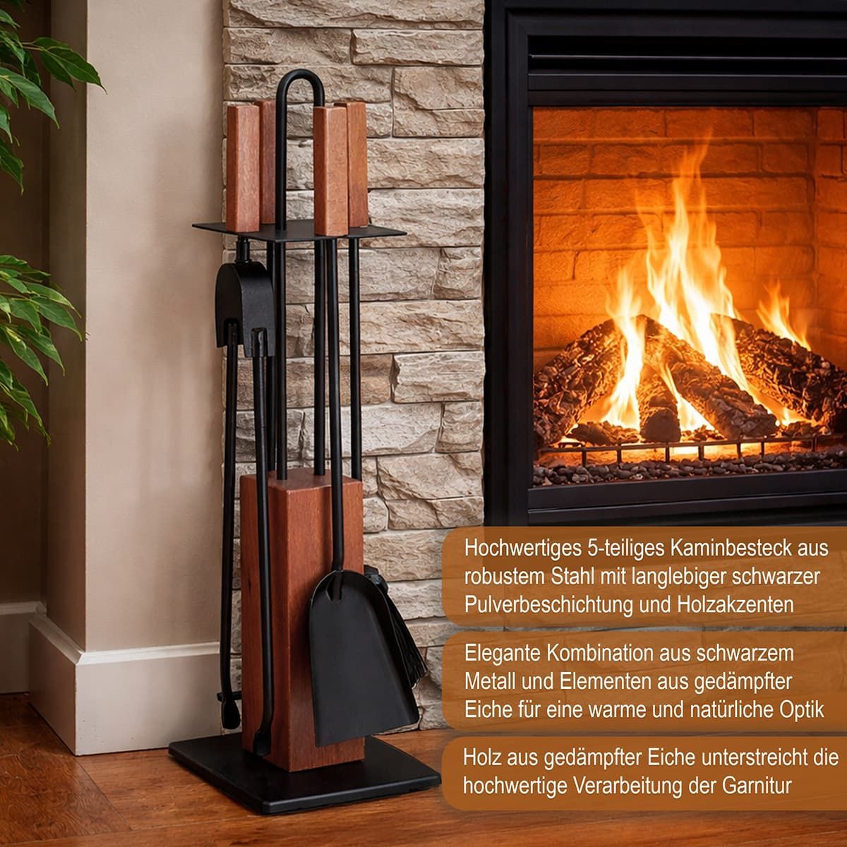 Ofenset Kaminbesteck Sockel & Griffe Eiche gedämpft Kamingarnitur Schwarz 5-tlg