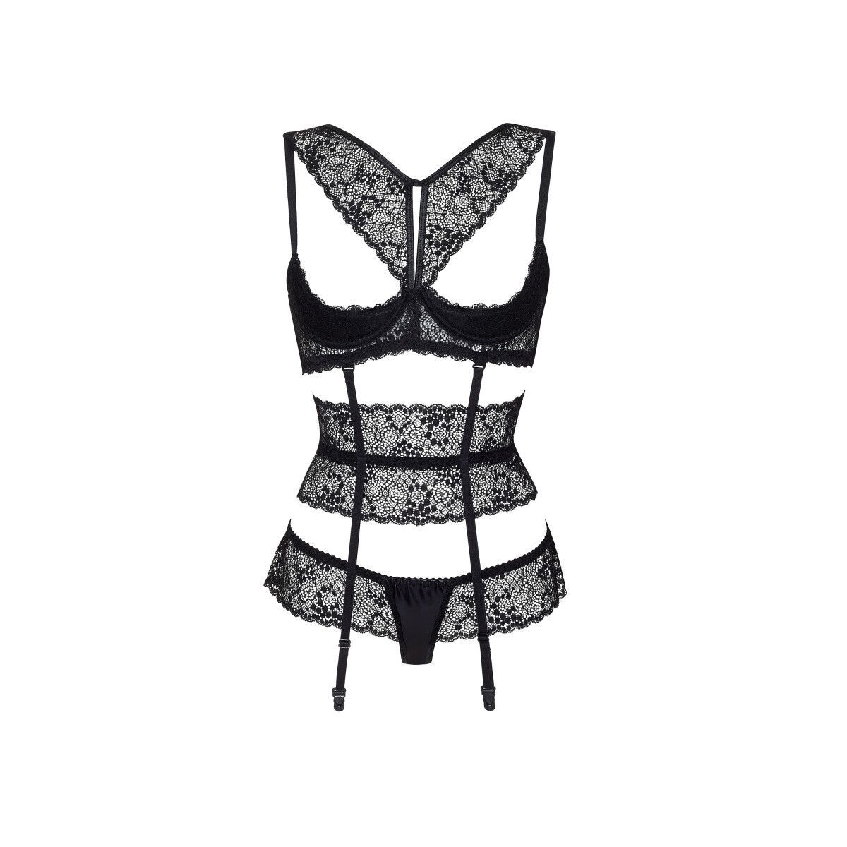 Offener BH mit String und Hüftgürtel 3-teiliges Set Lilie schwarz