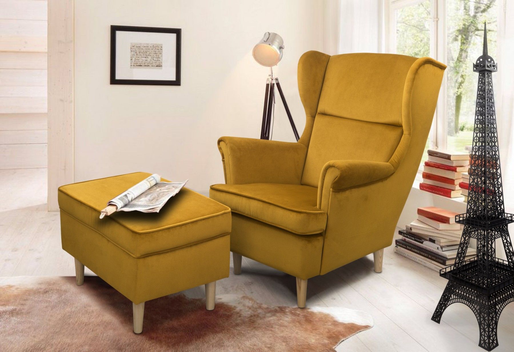 Ohrensessel mit Hocker Teramo bequemer Sessel Wohnung Relaxsessel Sofa gelb