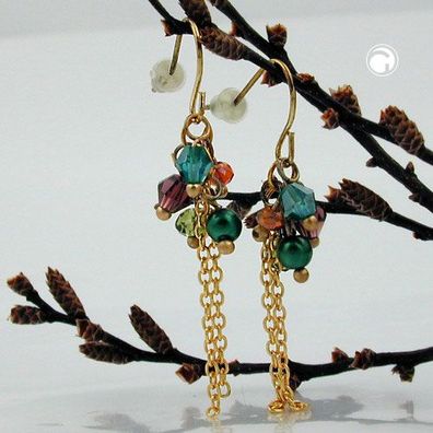 • Ohrhaken Ohrhänger Ohrringe 55mm mit goldfarbenen Blatt und vielen bunten Perlen