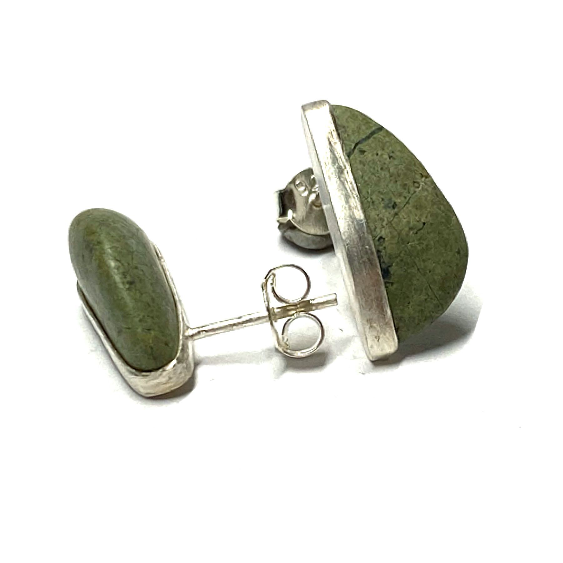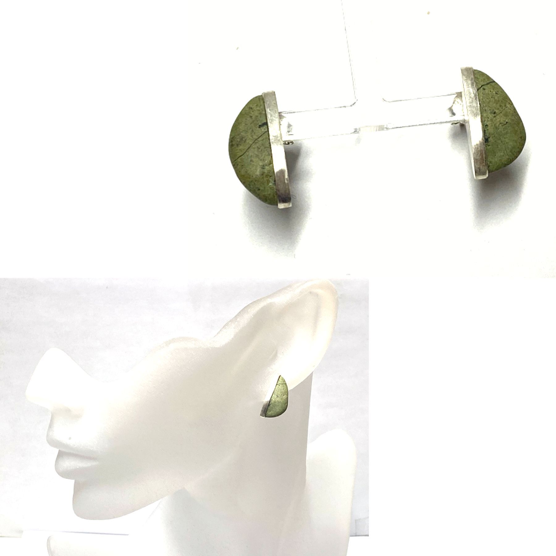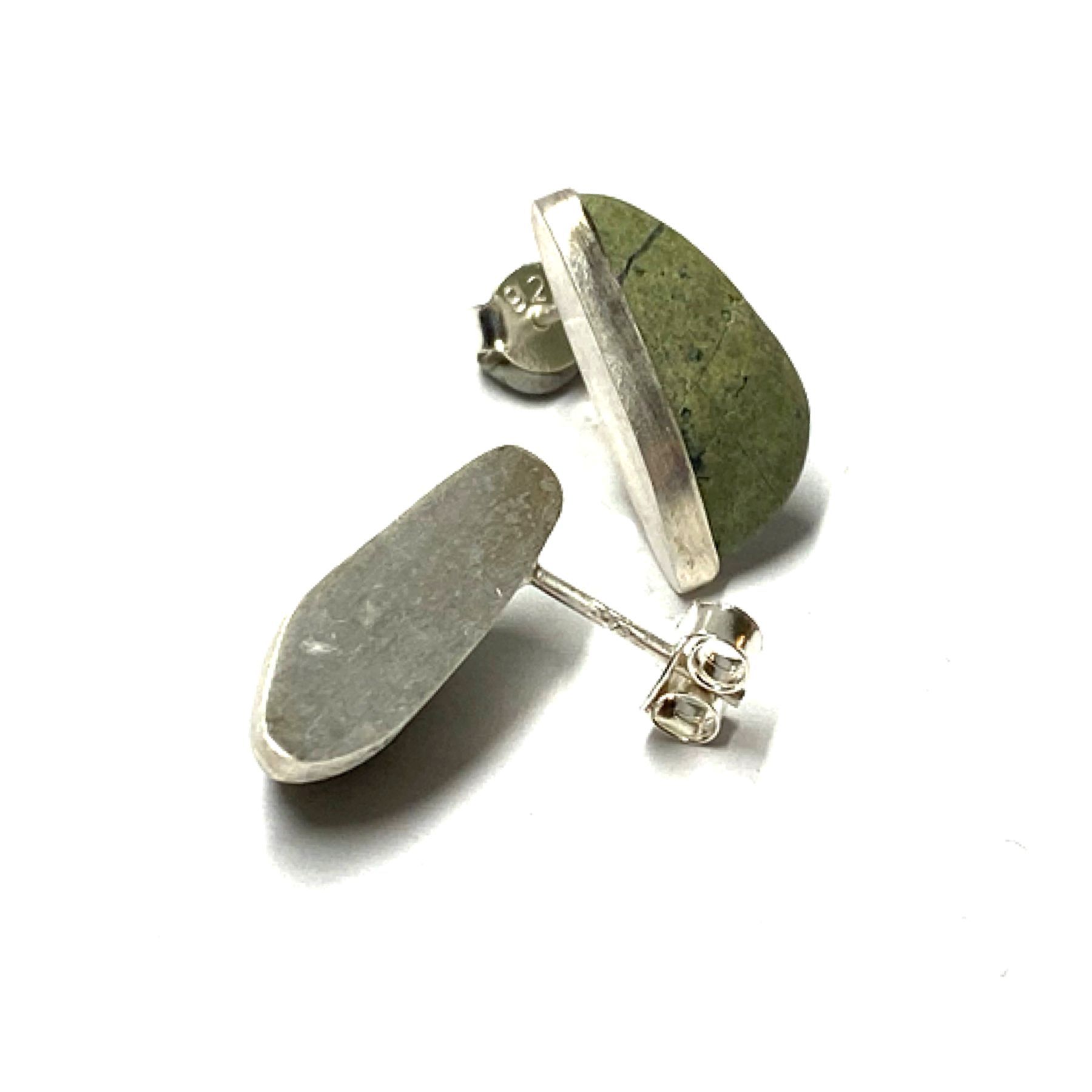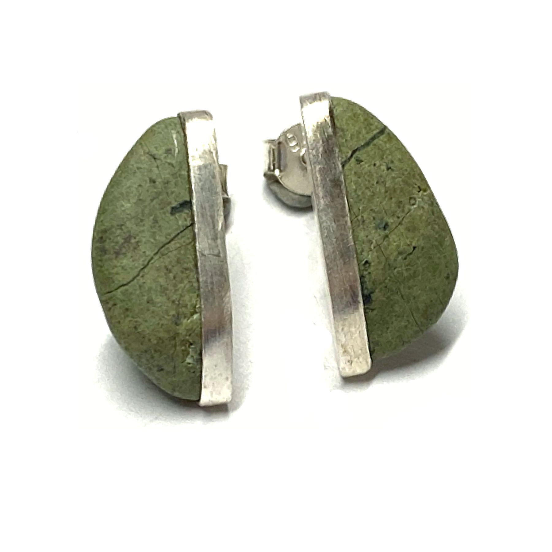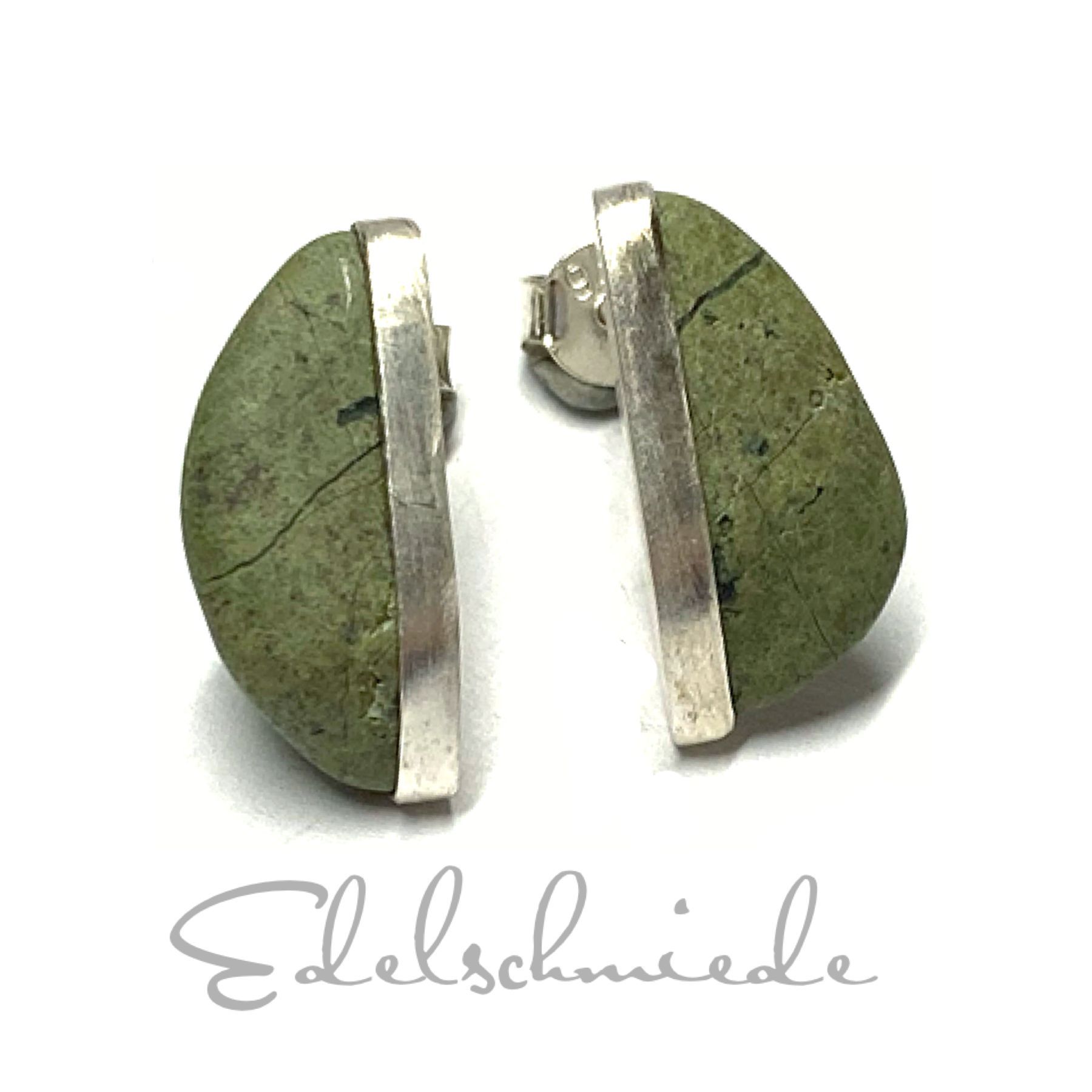 Ohrring 925/- Silber Kieselstein grün Naturform geteilt matte Oberfläche Ohrstecker