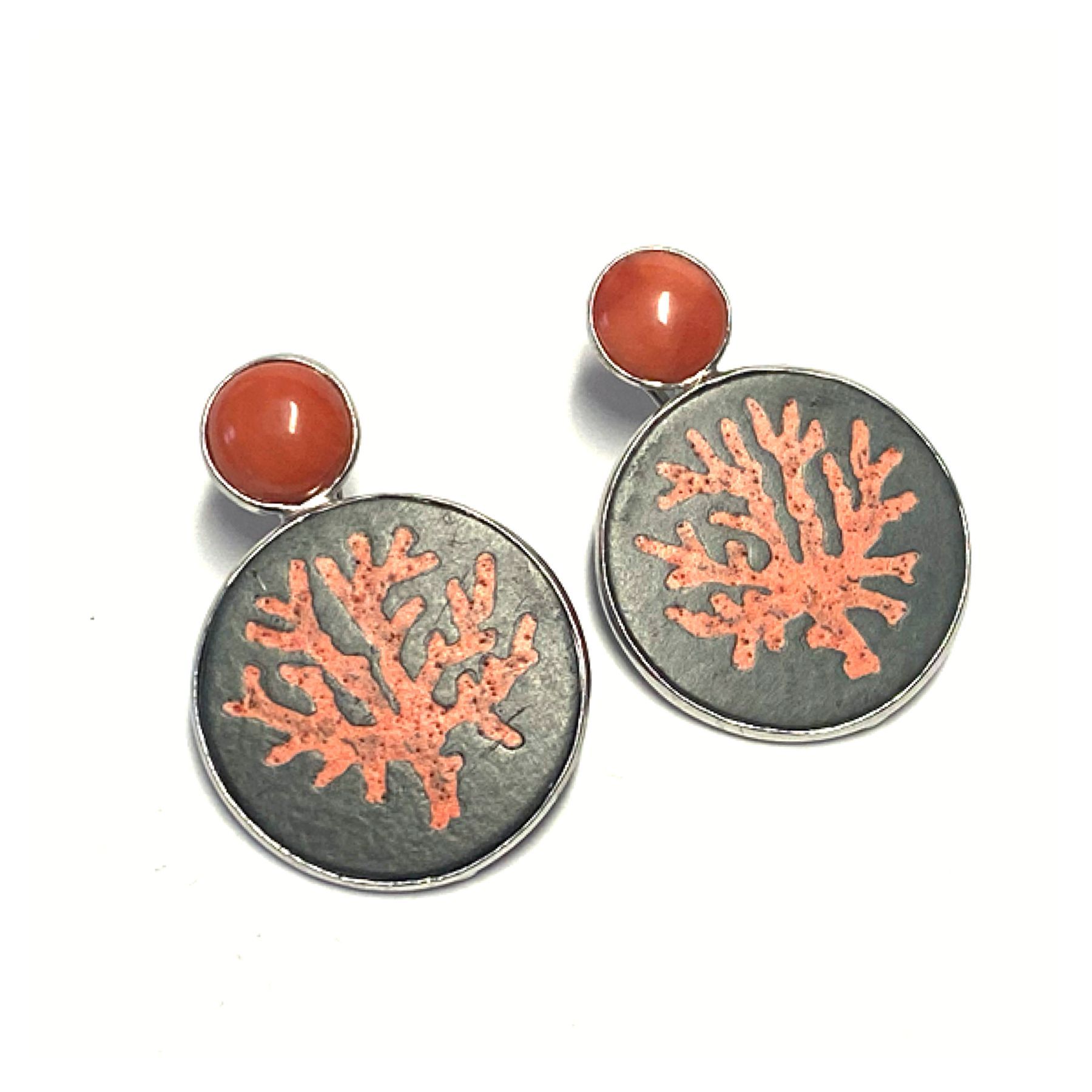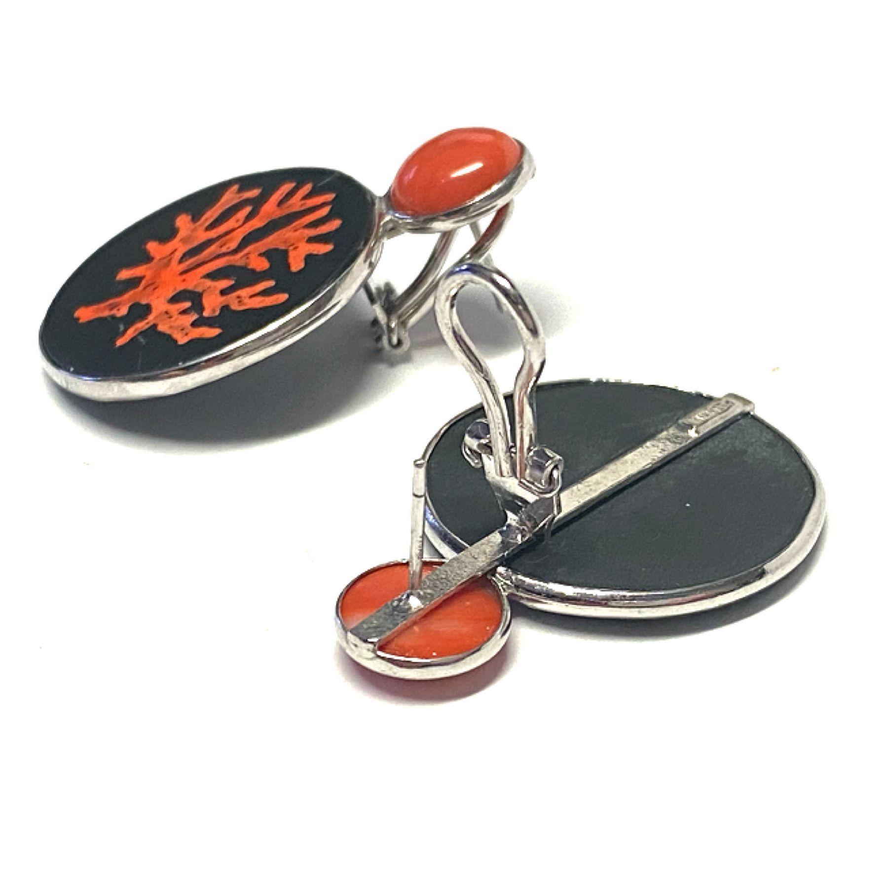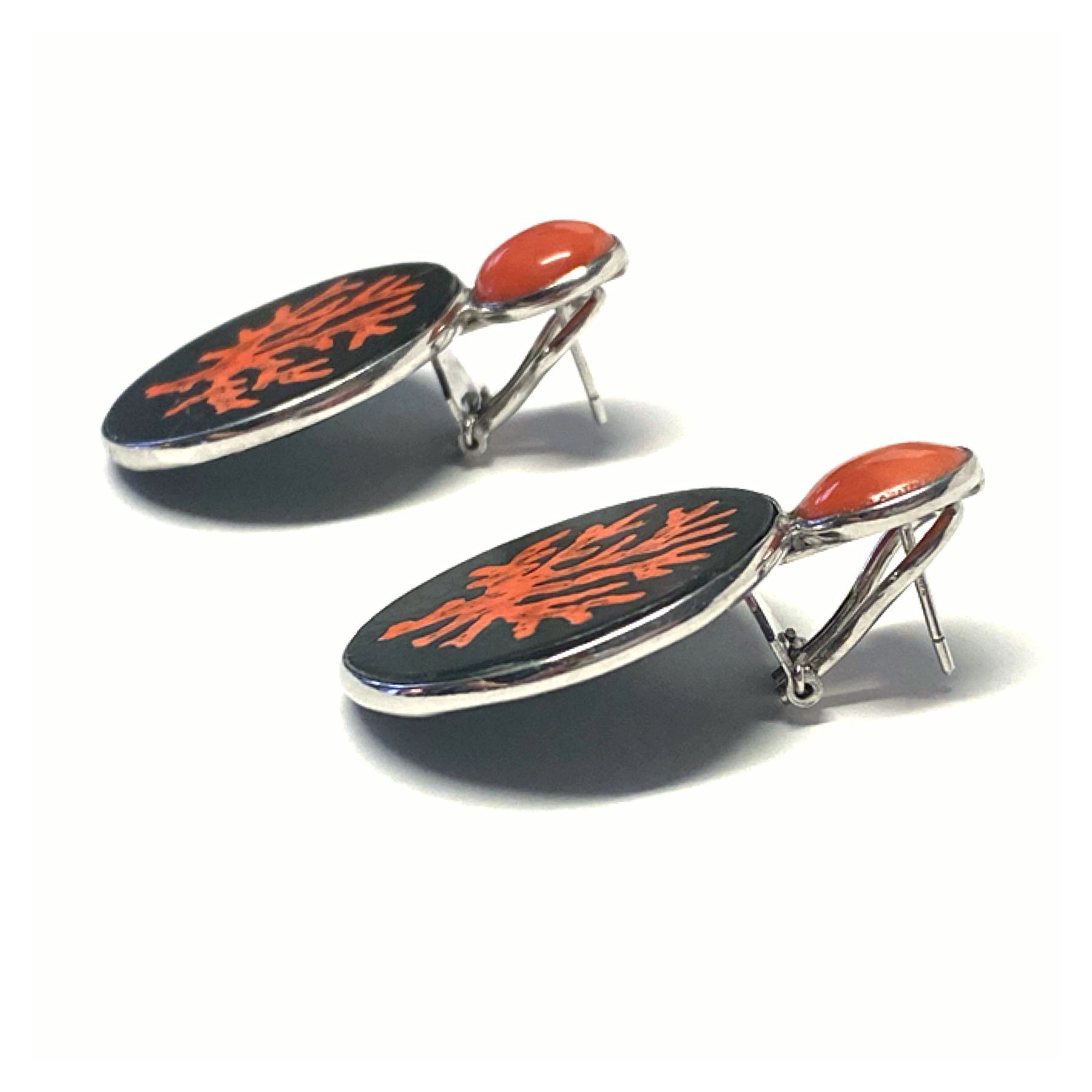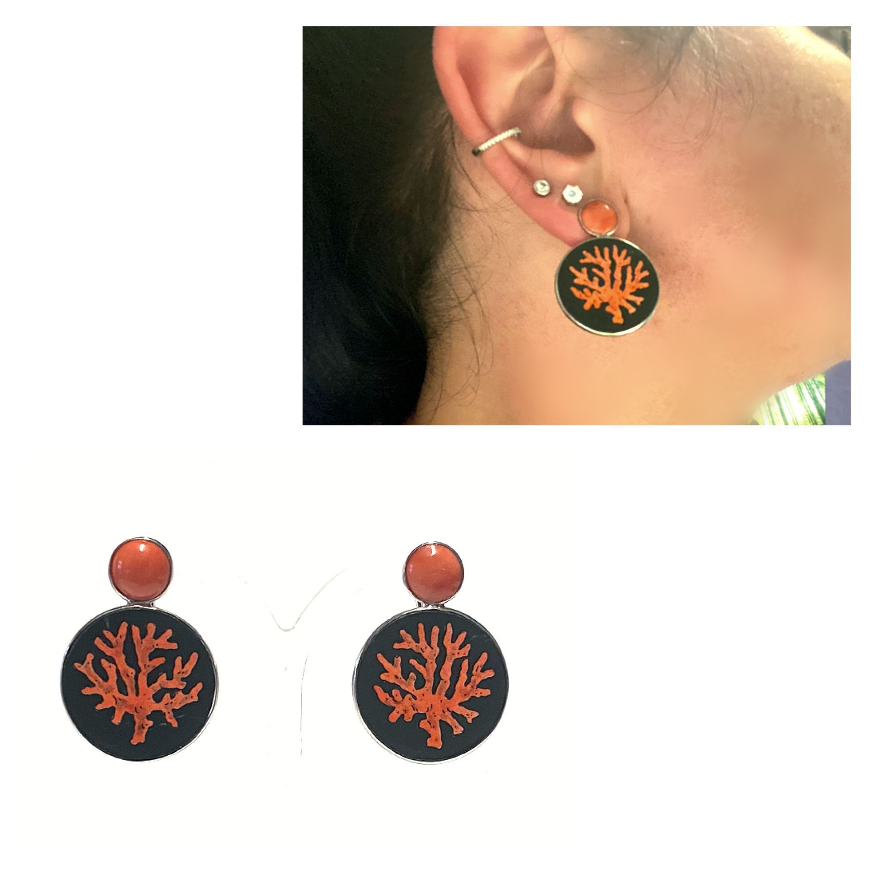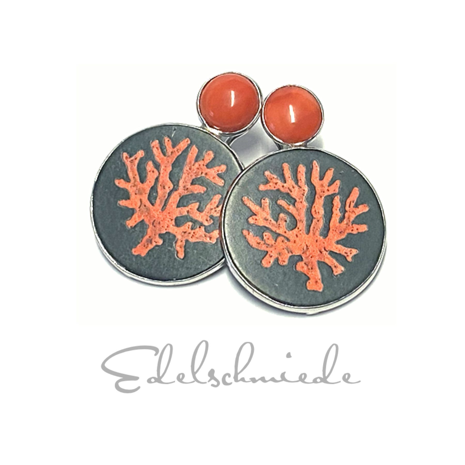 Ohrring 925/- Silber Koralle Cabochon Mikro Mosaik LavaGestein schwarz rot