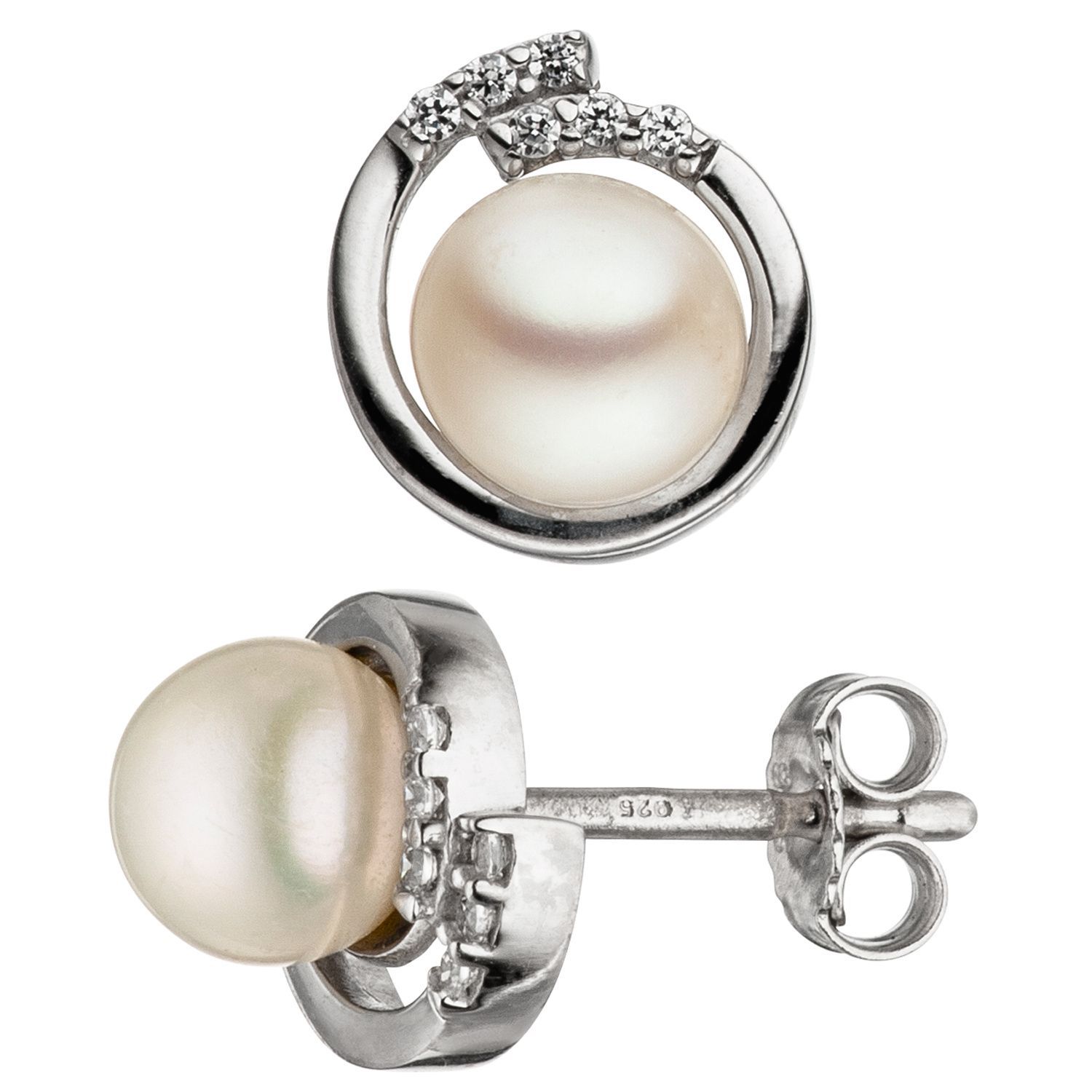 Ohrstecker 925 Sterling Silber mit 2 Süßwasser Perlen weiß und Zirkonia Ohrringe