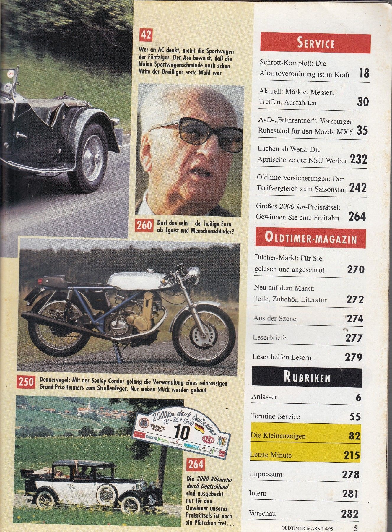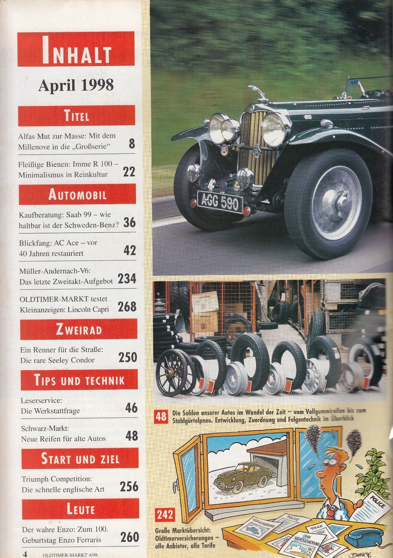 Oldtimer Markt Heft 4 1998 Alfa Romeo 1900 Imme R 100 Kaufberatung: Saab 99 Blickfang AC Ace Neue Reifen für Oldtimer Der wahre Enzo Donnervogel: Seeley Condor... Mehr