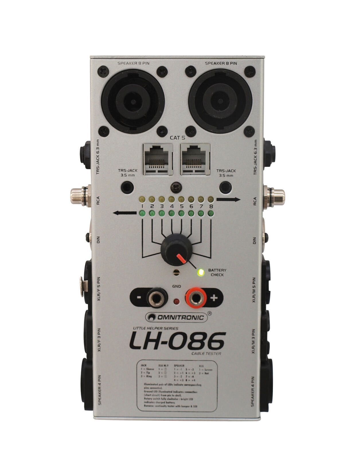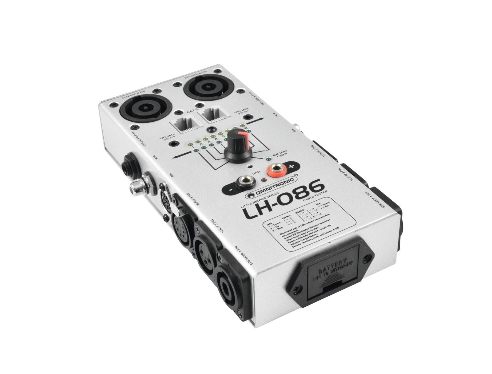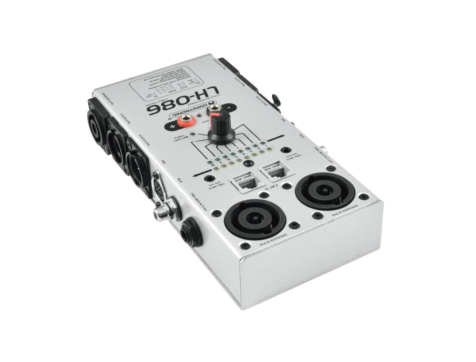 Omnitronic LH-086 Idealer Kabeltester für alle Kabelverbindungen im Studio- und Live-Betrieb Spannungsversorgung: 9 V Batterie Akku Prüft 3+5-pol. XLR-, 3,5 6,3-mm-Klinken- (auch Stereo), CAT5, DIN-, Cinch- und 4+8-pol. Speaker-Kabel und Steckverbindungen Anzeige der Polarität bzw. vorhandener Kurzs