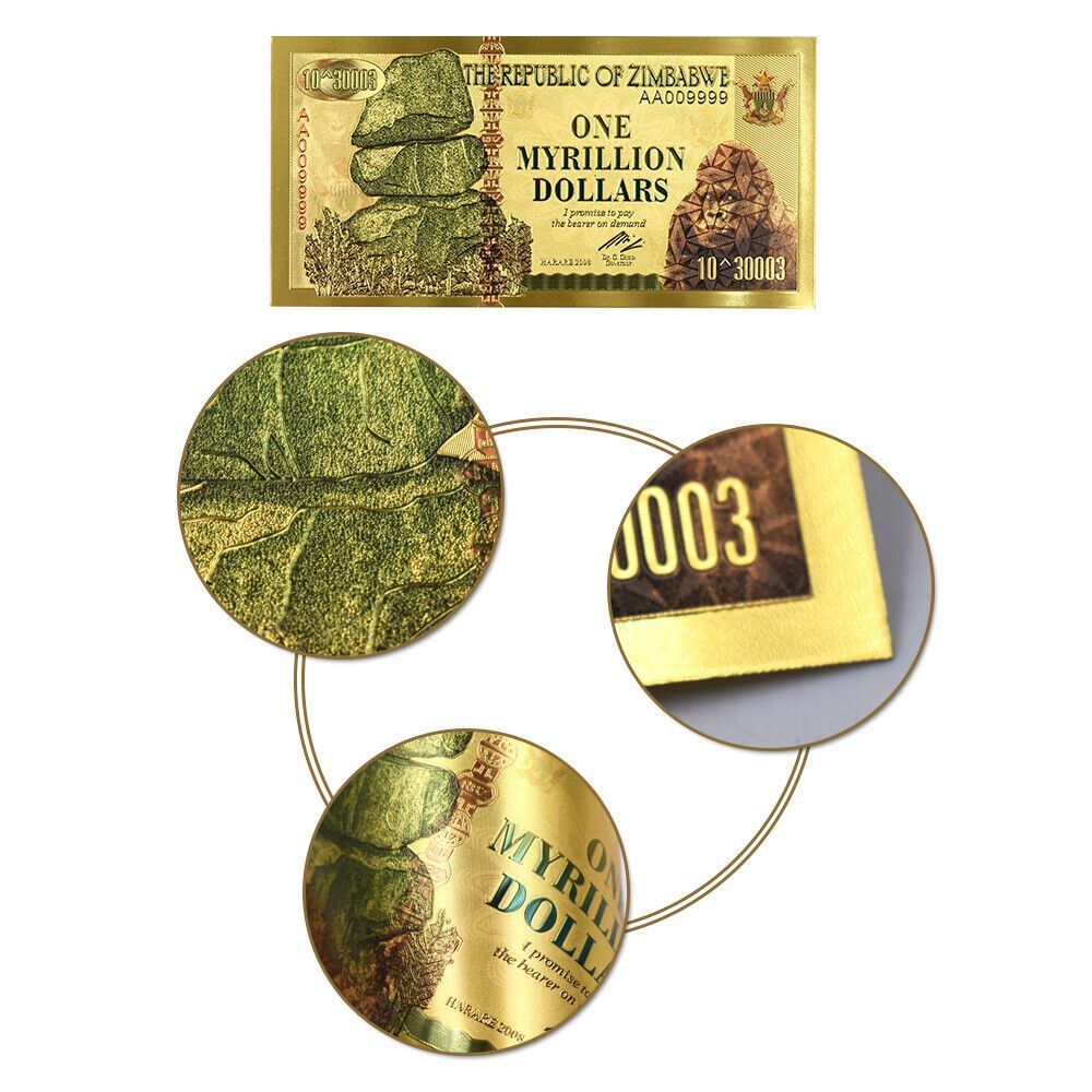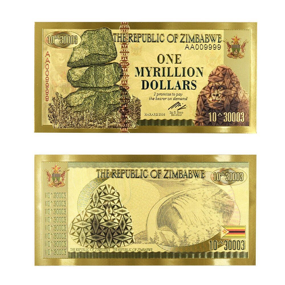 Banknote - Zimbabwe - Nachdruck - vergoldet Folie - sehr selten One Myrillion Dollar wie abgebildet Technische Information zum Artikel Material: vergoldet Größe: ca. original Größe Erhaltung: Neu Verpackung: Folie Das ideale Geschenk oder natürlich auch zum selber sammeln Natürlich handelt es sich h