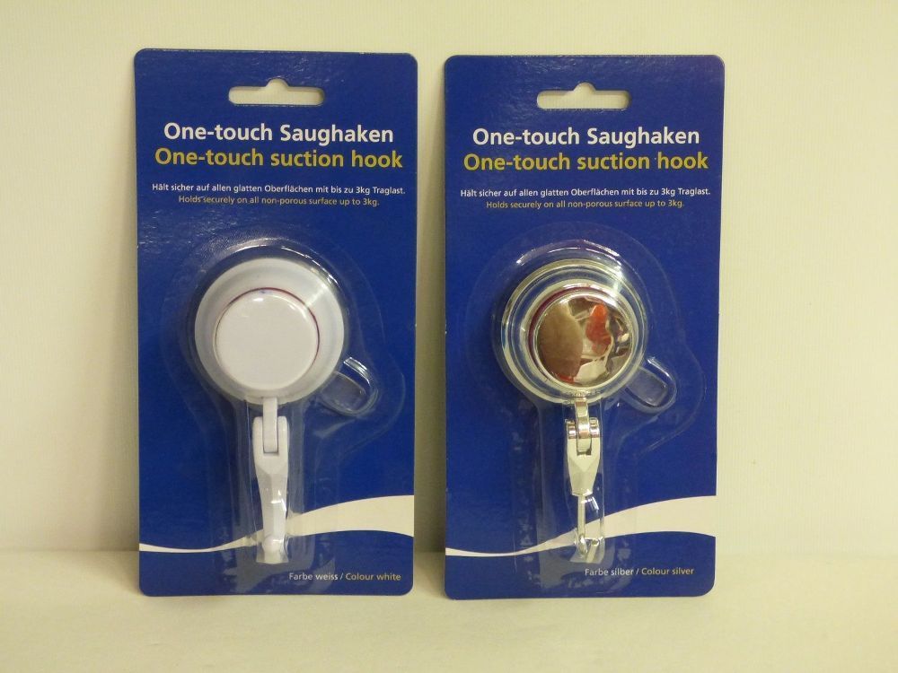 One-touch Saughaken - Untergrund muss sauber, trocken und fettfrei sein. - Haftet nicht auf rauen, porösen Oberflächen. - One-touch Saughaken positionieren und Knopf drücken bis der rote Bereich nicht mehr zu sehen ist. - Zum Lösen seitliche Lasche ziehen. - Traglast bis 3 kg.
