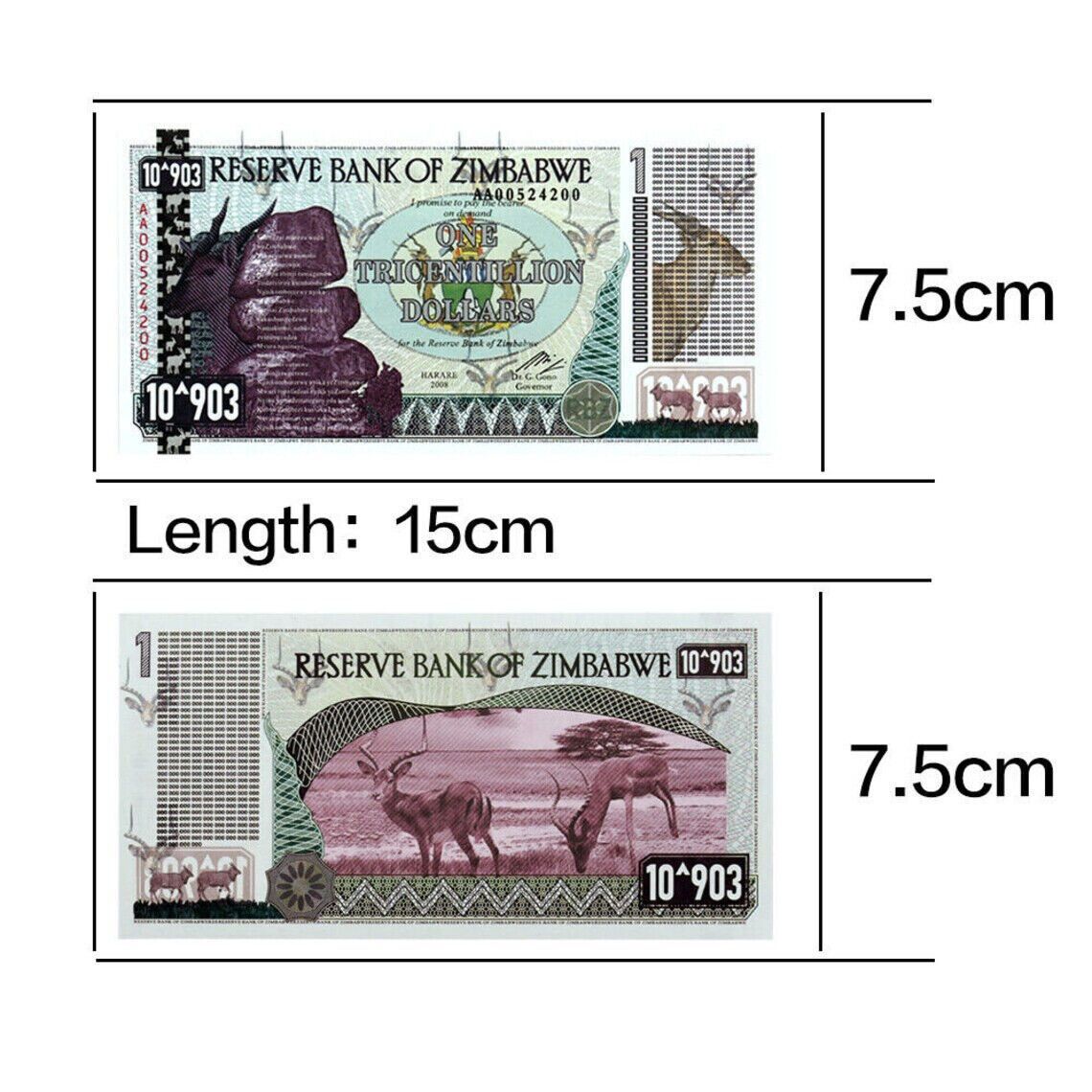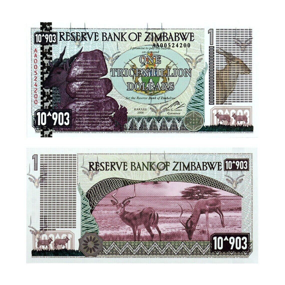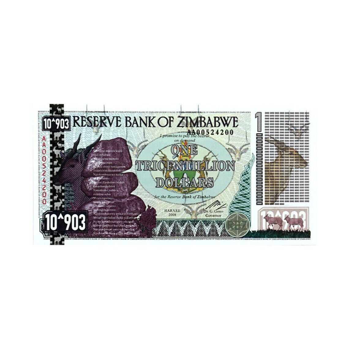 Diese Auflistung ist für eine extra feine $ One Tricentillion Simbabwe Dollar Special Agro Cheque (Banknote) aus dem Jahr 2008. Diese One Tricentillion Simbabwe 2008 Note war ein Teil der Serie der 2008 2009-Inflationswährung,. Die Scheine haben unterschiedliche Seriennummern. Mehr als ein Jahrzehnt