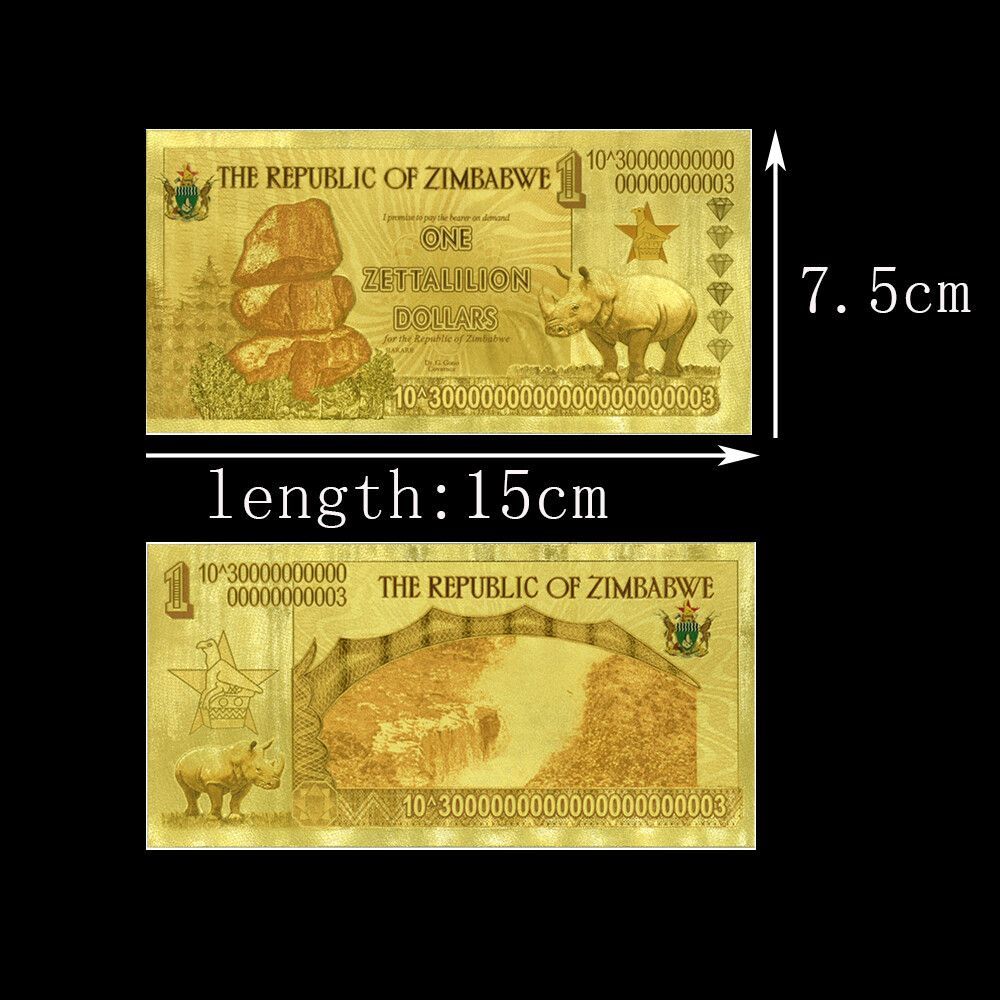 Banknote One Zettalilion - Zimbabwe - Nachdruck - vergoldet Folie - sehr selten Technische Information zum Artikel Material: vergoldet Größe: ca. original Größe Erhaltung: Neu Verpackung: Folie Das ideale Geschenk oder natürlich auch zum selber sammeln Natürlich handelt es sich hier nicht um echtes