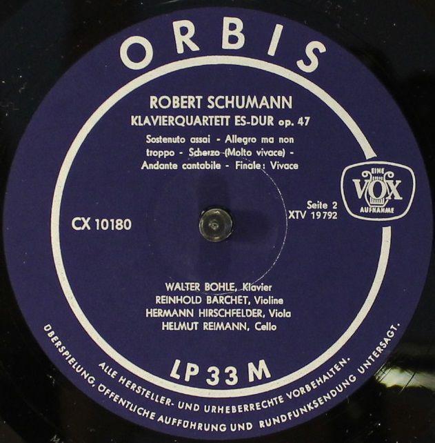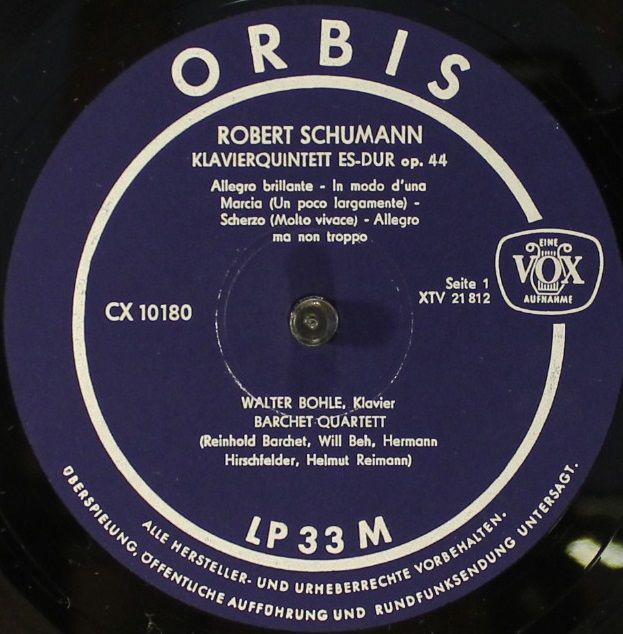Condition Vinyl Near Mint (NM or M-) Condition Sleeve Very Good (VG) Tracks included: Klavierquintett Es-Dur Op.44 Cello : Helmut Reimann Ensemble : Barchet-Quartett Piano : Walter Bohle Viola : Hermann Hirschfelder Violin : Reinhold Barchet Violin : Will Beh I 1. > Allegro Brillante 2. > In M
