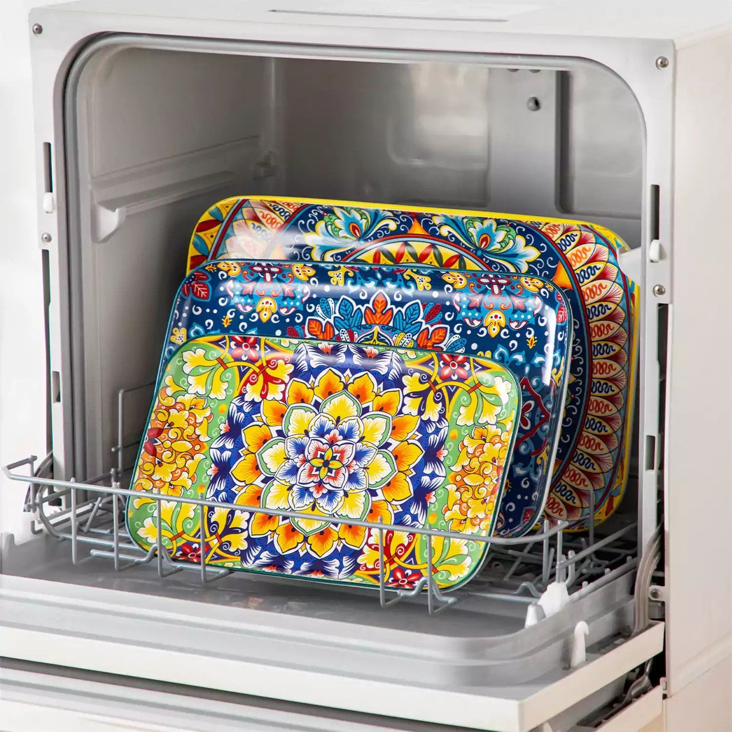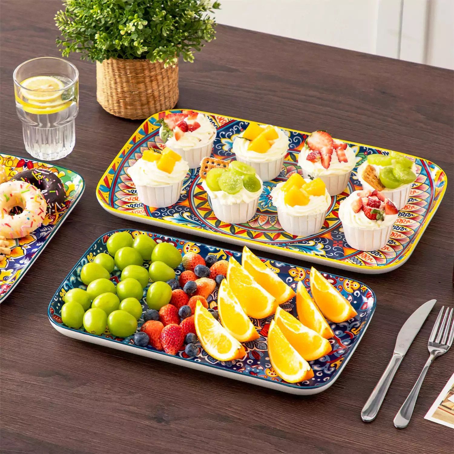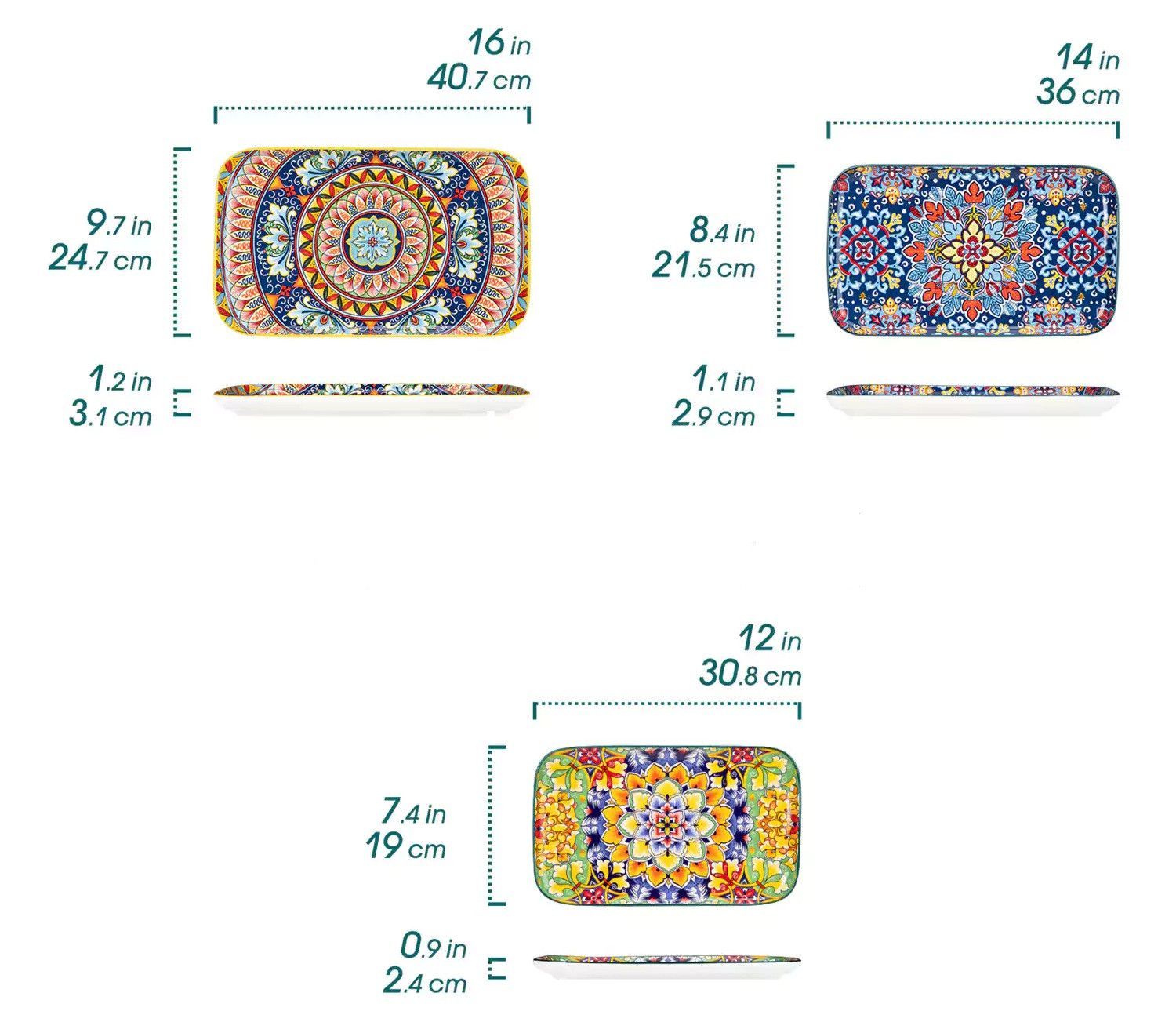 Orientalisch-mediterranes Porzellangeschirr - Spezifikation Material: Hochwertiges Porzellan Finish: Glänzende Oberfläche Gesamtanzahl: 3 kunstvoll gestaltete Servierplatten Set-Inhalt: Große Platte: 16 × 9,7 (40,7 cm × 24,7 cm) Mittlere Platte: 14 × 8,4 (36 cm × 21,5 cm) Kleine Platte: 12 × 7,4 (30