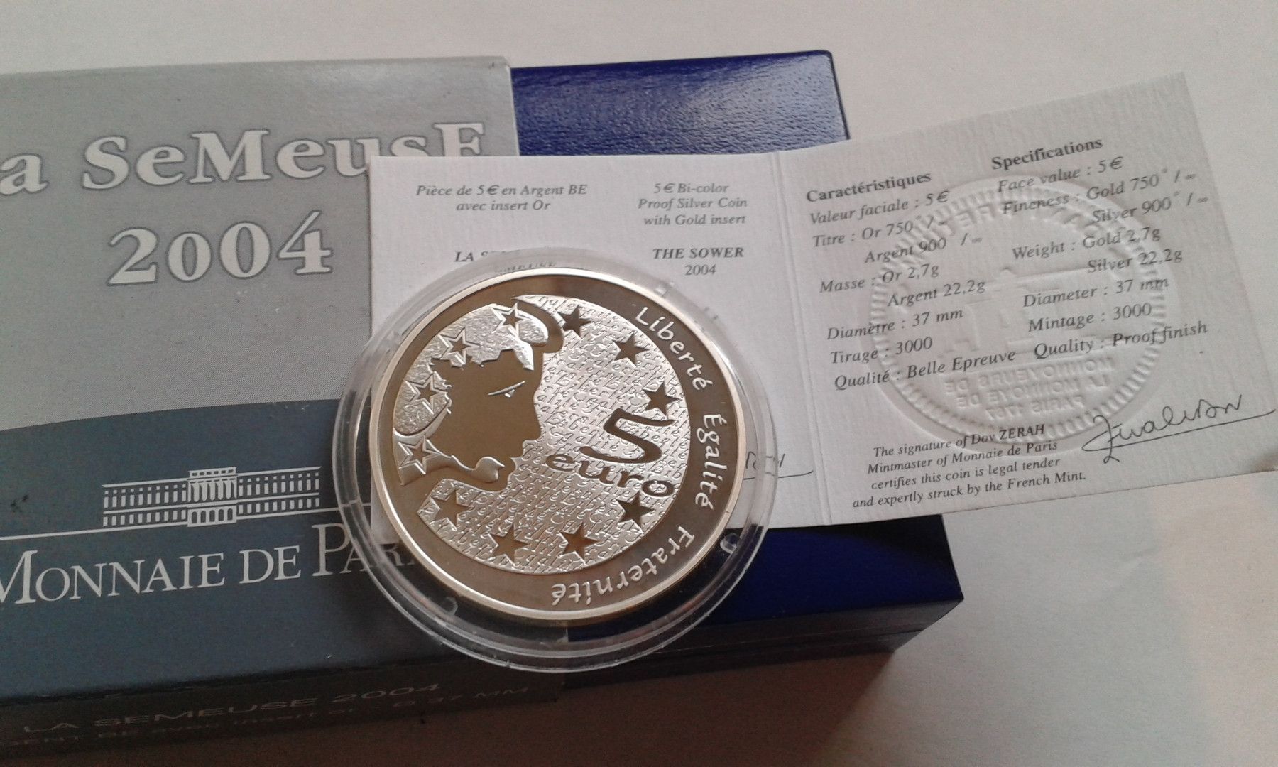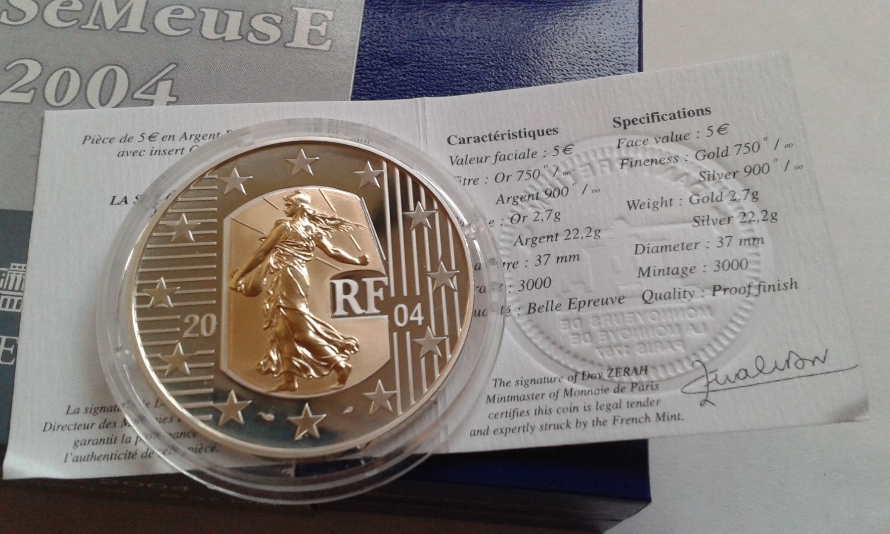 Original mit Etui, Zertifikat und Umverpackung Bimetallmünze: 2.7g 750er Gold und 22,2 g Silber 900er. bei Fragen: